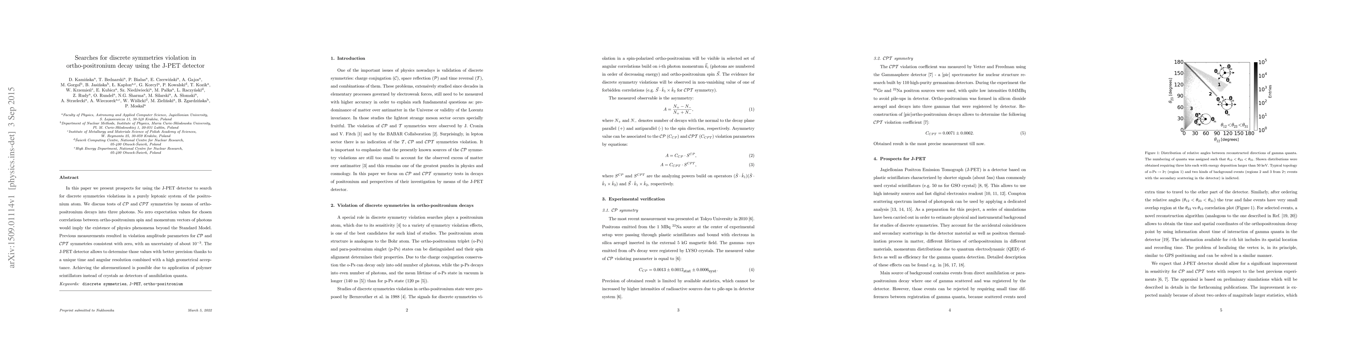 This paper explores the use of the J-PET detector to detect potential violations of discrete symmetries in ortho-positronium decay into three photons, aiming to test CP and CPT symmetries. The J-PET detector's high time and angular resolution, along with its high geometrical acceptance, promises improved precision over previous measurements.