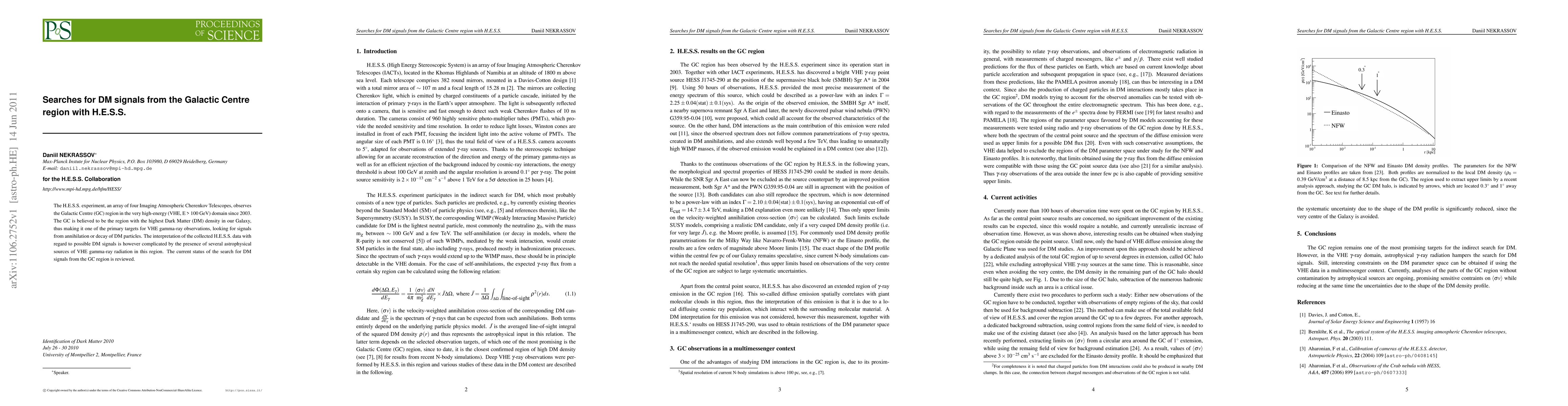 The H.E.S.S. experiment, an array of four Imaging Atmospheric Cherenkov Telescopes, observes the Galactic Centre (GC) region in the very high-energy (VHE, E > 100 GeV) domain since 2003. The GC is believed to be the region with the highest Dark Matter (DM) density in our Galaxy, thus making it one of the primary targets for VHE gamma-ray observations, looking for signals from annihilation or decay of DM particles. The interpretation of the collected H.E.S.S. data with regard to possible DM signals is however complicated by the presence of several astrophysical sources of VHE gamma-ray radiation in this region. The current status of the search for DM signals from the GC region is reviewed.