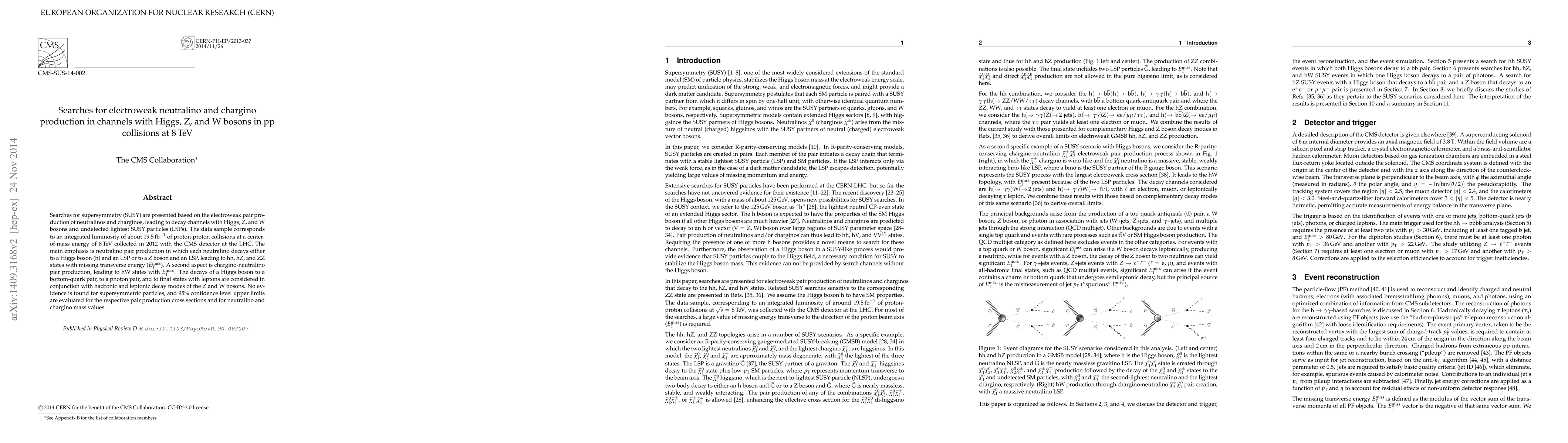 This paper reports on searches for electroweak neutralino and chargino production in proton-proton collisions at 8 TeV, focusing on decay channels involving Higgs, Z, and W bosons, with no evidence found for supersymmetric particles. Upper limits on pair production cross sections and mass values for neutralinos and charginos are established at the 95% confidence level.