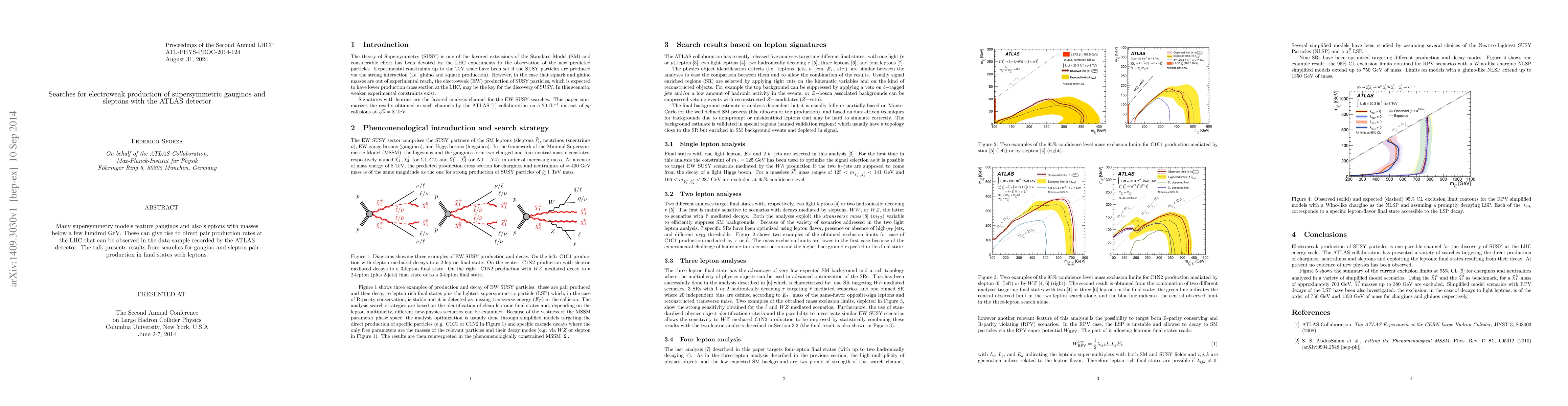 Summary: This paper reports on searches for electroweak production of supersymmetric particles called gauginos and sleptons at the LHC using the ATLAS detector, focusing on final states with leptons to identify potential direct pair production events. The results aim to provide insights into the viability of these models within the mass range below a few hundred GeV.