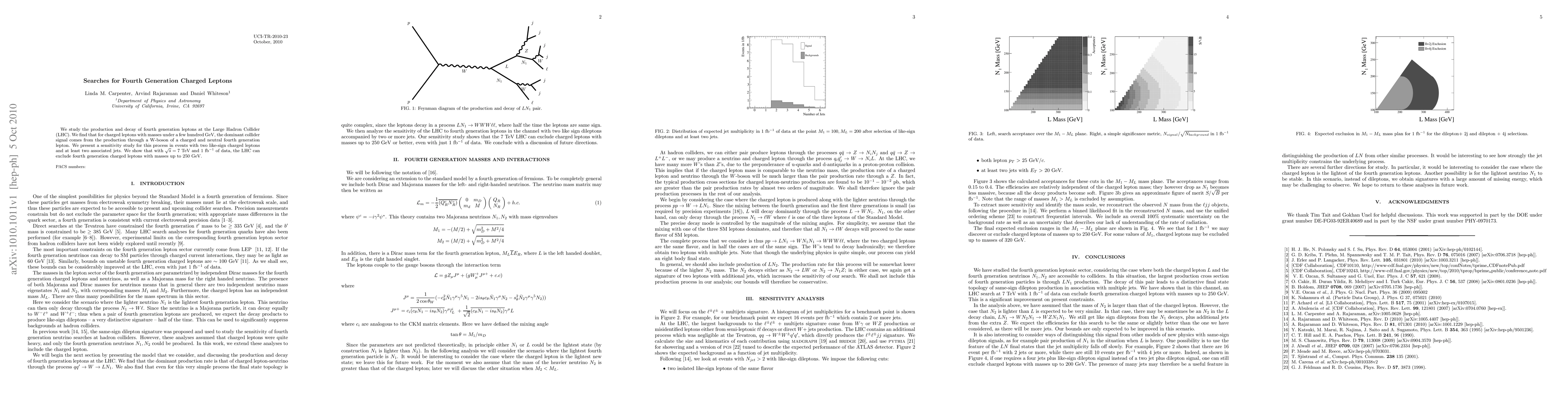 This paper investigates the production and decay of fourth generation charged leptons at the LHC, finding that the primary signal involves a W-boson producing a charged and neutral fourth generation lepton. With 7 TeV energy and 1 inverse fb of data, the LHC can exclude such leptons with masses up to 250 GeV.