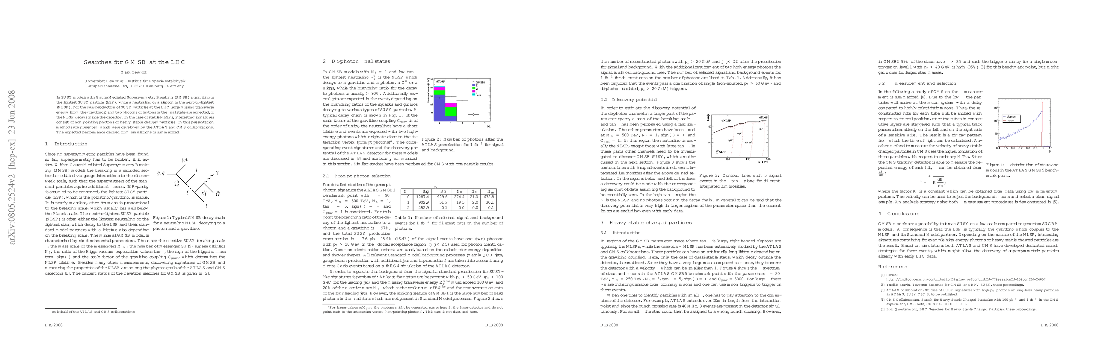 This paper summarizes the methods developed by ATLAS and CMS collaborations to search for evidence of Gauge Mediated Supersymmetry Breaking (GMSB) at the LHC, focusing on signatures such as large missing transverse energy and photon or lepton pairs from the decay of the next-to-lightest SUSY particle (NLSP). The expected performance of these searches is derived from simulations.
