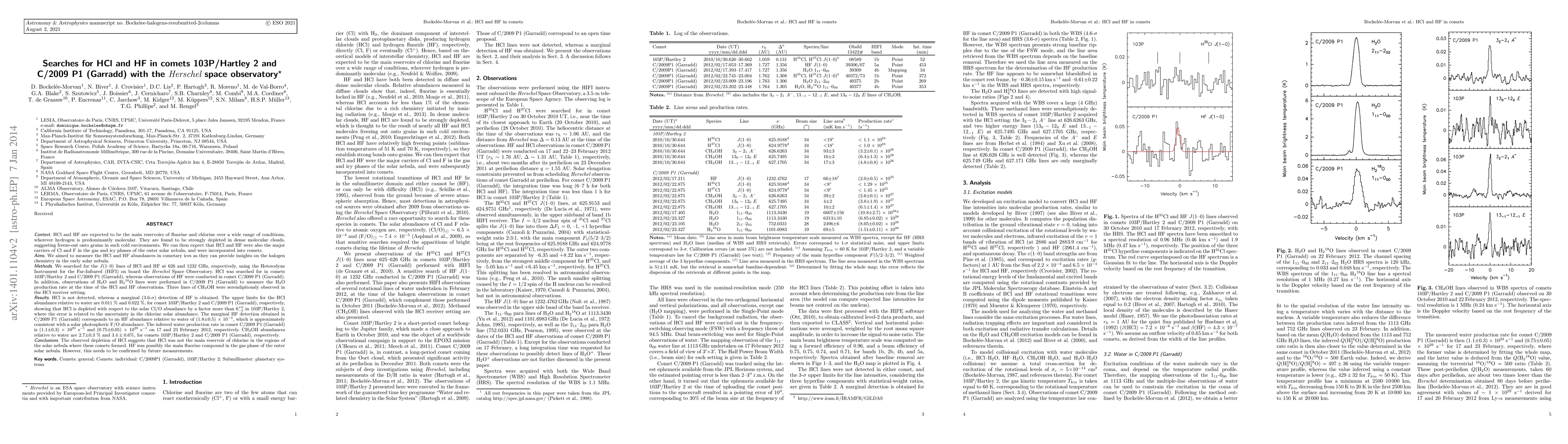 This study used the Herschel Space Observatory to search for HCl and HF in comets 103P/Hartley 2 and C/2009 P1 (Garradd), finding no HCl but a marginal HF detection in C/2009 P1. The results suggest significant depletion of HCl, indicating it was not the main chlorine reservoir in the early solar nebula.