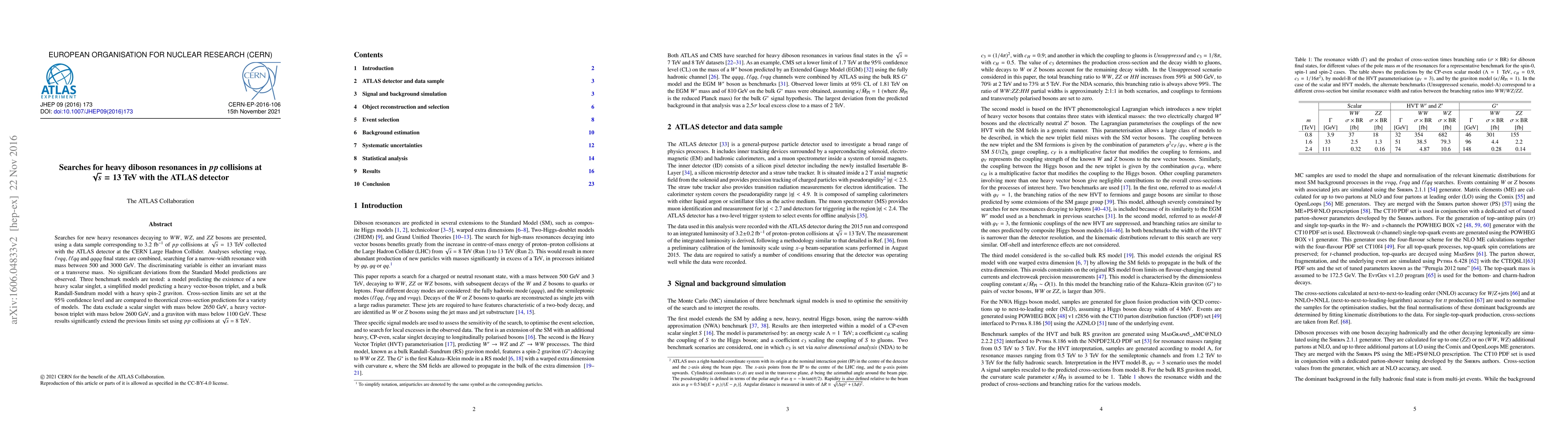This paper reports searches for heavy diboson resonances in $pp$ collisions at $\sqrt{s}=13$ TeV using the ATLAS detector, analyzing data corresponding to 3.2 fb$^{-1}$. No significant deviations from Standard Model predictions were observed, leading to exclusion limits for new heavy scalars, vector-boson triplets, and spin-2 gravitons.