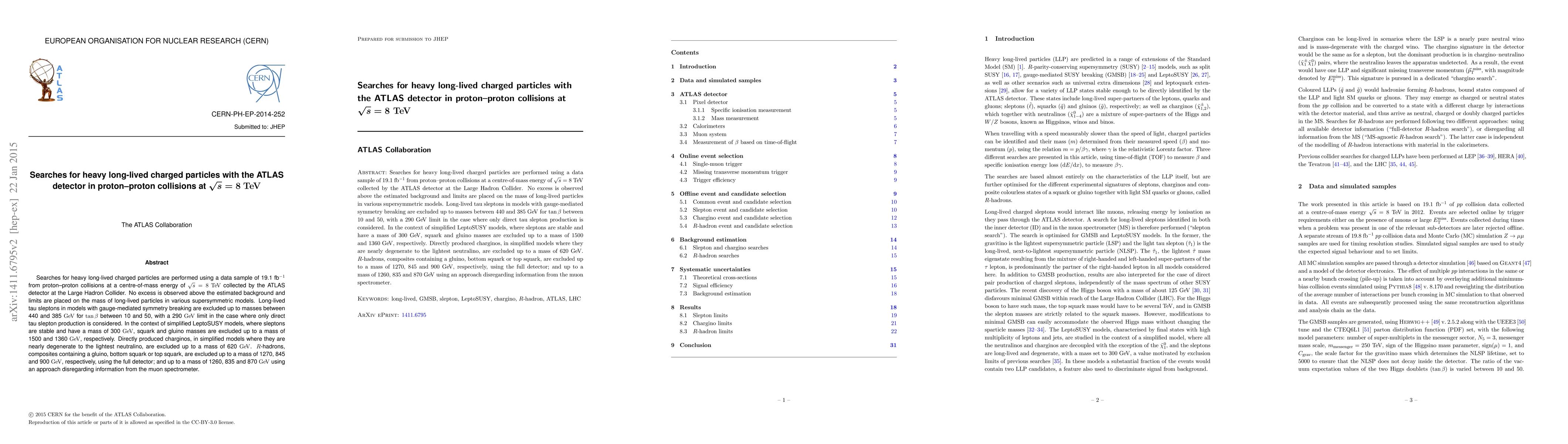 Researchers used the ATLAS detector to search for heavy long-lived charged particles in proton-proton collisions at 8 TeV, setting limits on masses of various supersymmetric models.