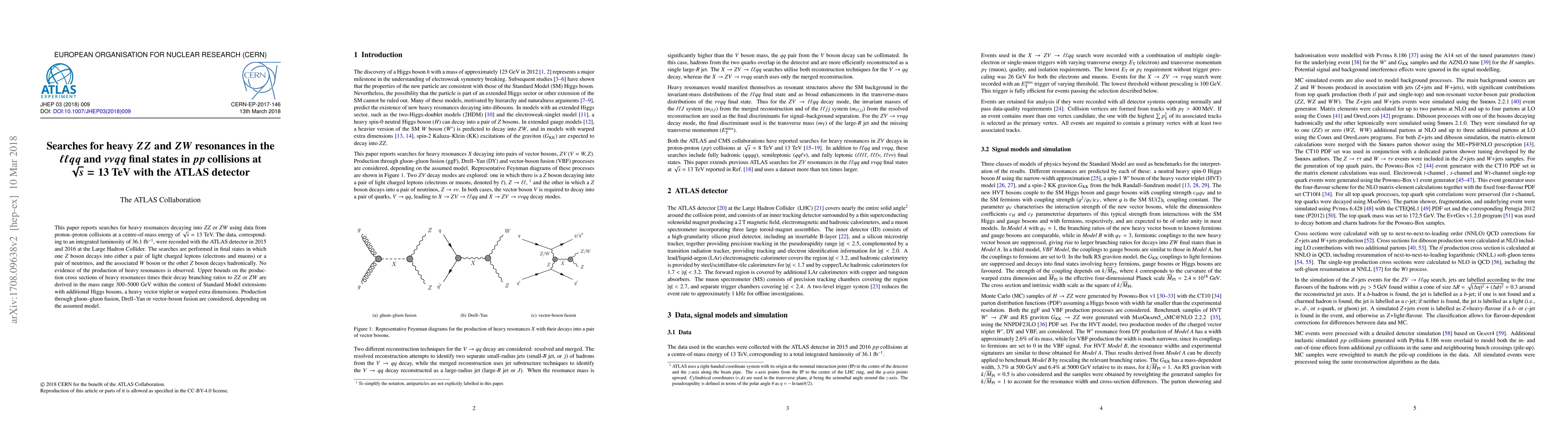 This paper investigates heavy $ZZ$ and $ZW$ resonances in $pp$ collisions at $\sqrt{s}=13$ TeV using ATLAS data from 2015-2016, finding no evidence of their production and setting upper limits on their cross sections in various theoretical models.