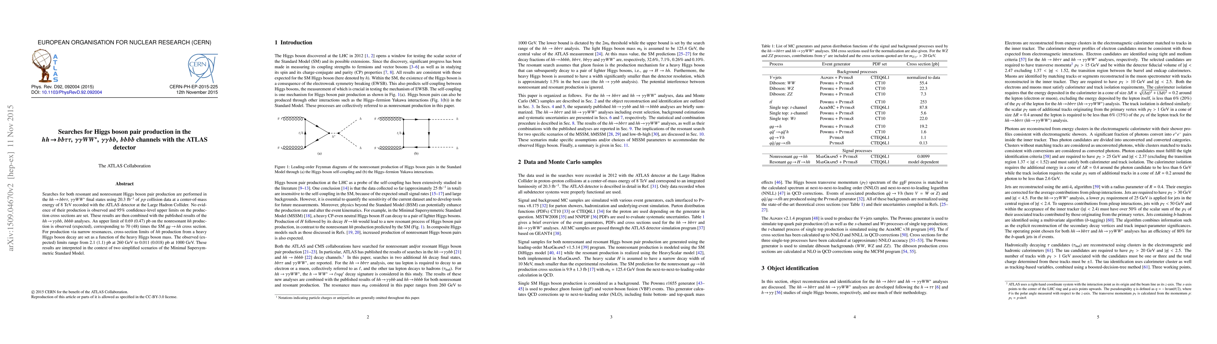 Searches for both resonant and non-resonant Higgs boson pair production are performed in the $hh\to bb\tau\tau, \gamma\gamma WW^*$ final states using 20.3 fb$^{-1}$ of $pp$ collision data at a center-of-mass energy of 8 TeV recorded with the ATLAS detector at the Large Hadron Collider. No evidence of their production is observed and 95\% confidence level upper limits on the production cross sections are set. These results are then combined with the published results of the $hh\to \gamma\gamma bb, bbbb$ analyses. An upper limit of 0.69 (0.47) pb on the non-resonant Standard Model like $hh$ production is observed (expected), corresponding to 70 (48) times of the SM $gg\to hh$ cross section. For production via narrow resonances, cross section limits of $hh$ production from a heavy Higgs boson decay are set as a function of the heavy Higgs boson mass. The observed (expected) limits range from 2.1 (1.1) pb at 260 GeV to 0.011 (0.018) pb at 1000 GeV. These results are interpreted in the context of two simplified scenarios of the Minimal Supersymmetric Standard Model.