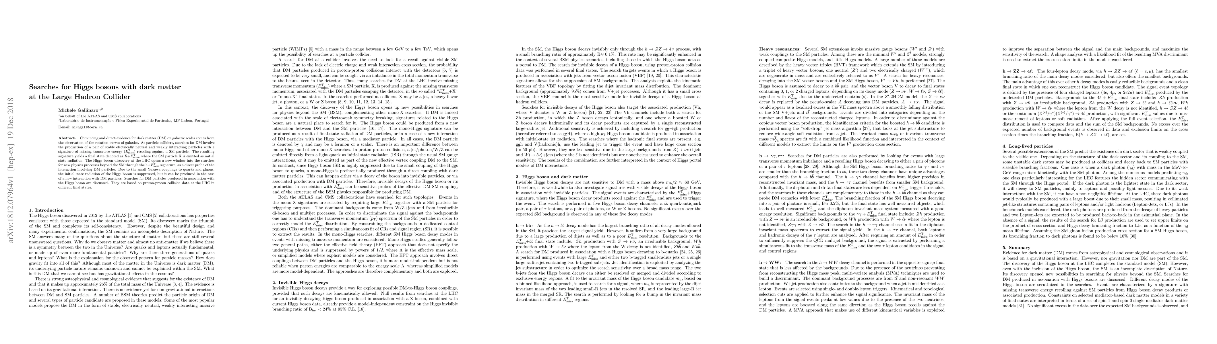 Convincing and direct evidence for dark matter (DM) on galactic scales comes from the observation of the rotation curves of galaxies. At particle colliders, searches for DM involve the production of a pair of stable electrically neutral and weakly interacting particles with a signature of missing transverse energy ($E^{\rm T}_{\rm miss}$) recoiling against a SM particle. The resulting signature yields a final state denoted as X+$E^{\rm T}_{\rm miss}$, where the SM particle X is emitted as initial state radiation. The Higgs boson discovery at the LHC opens a new window into the searches for new physics processes beyond the SM through the h+$E^{\rm T}_{\rm miss}$ signature, as a direct probe of the interaction involving DM particles. Due to the small Yukawa couplings to quarks and gluons, the initial state radiation of the Higgs boson is suppressed, but it can be produced in the case of a new interaction with DM particles. Searches for DM particles produced in association with the Higgs boson are discussed. They are based on proton-proton collision data at the LHC in different final states.