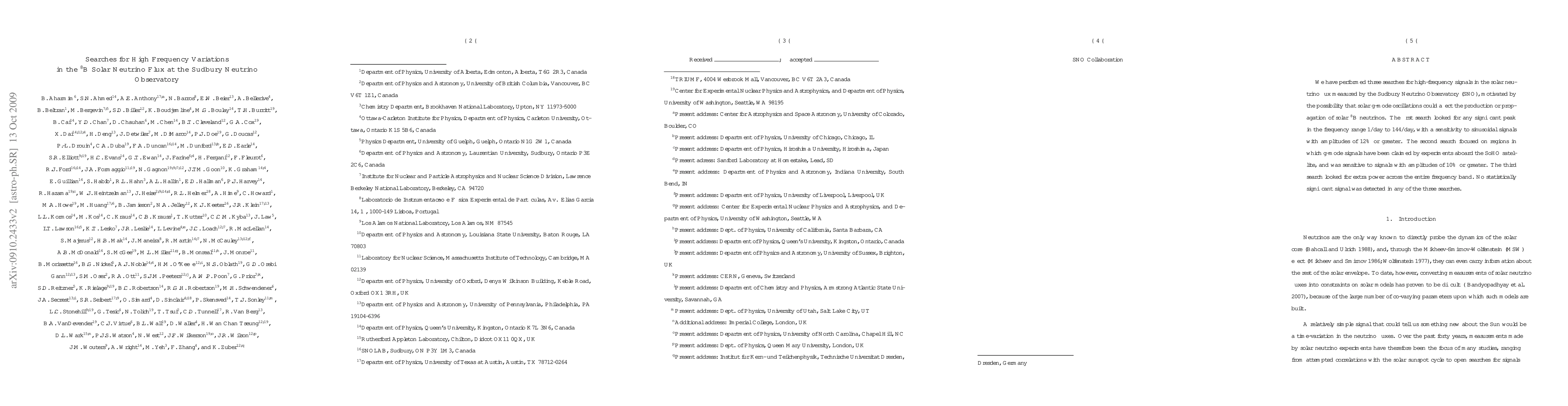 The Sudbury Neutrino Observatory conducted three searches for high-frequency variations in the solar $^8$B neutrino flux, but found no statistically significant signals, ruling out significant $g$-mode oscillations affecting these neutrinos in the examined frequency ranges.