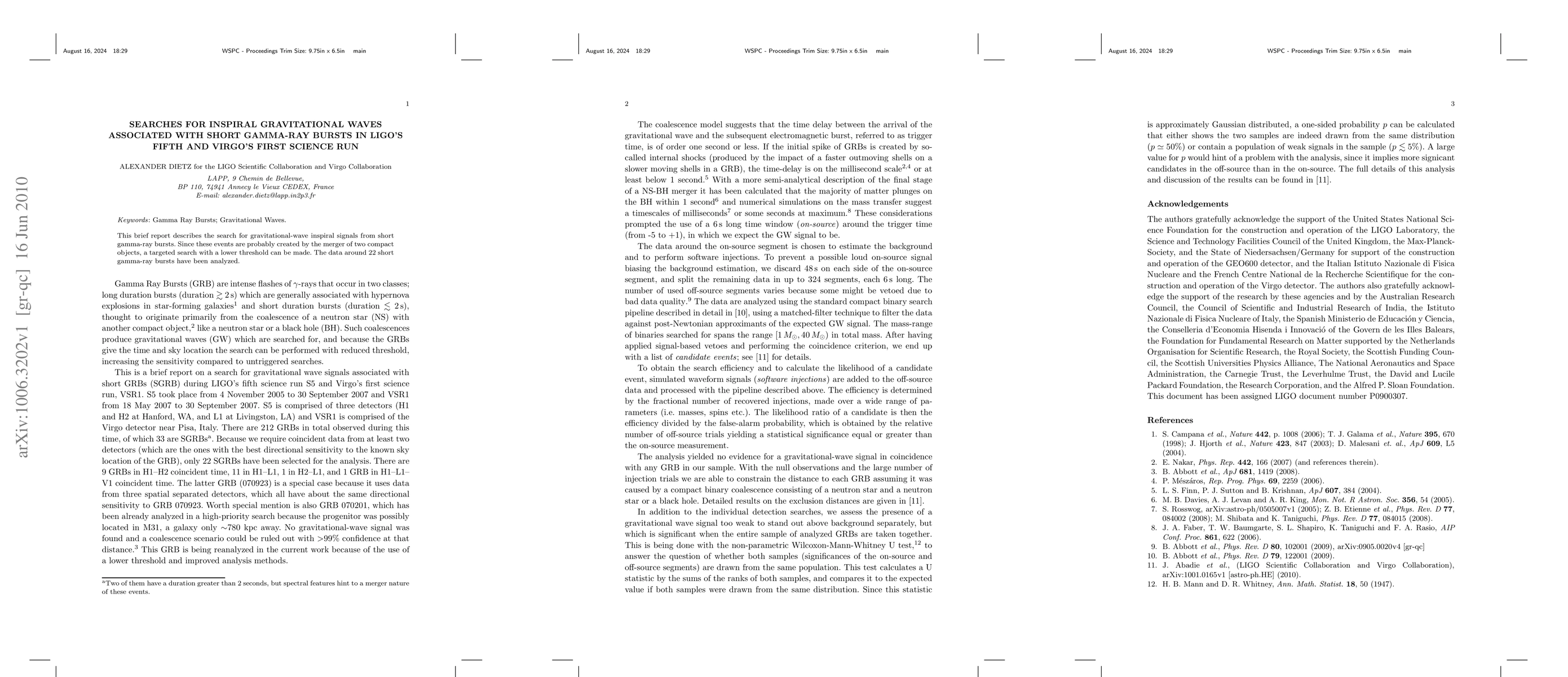 This brief report describes the search for gravitational-wave inspiral signals from short gamma-ray bursts. Since these events are probably created by the merger of two compact objects, a targeted search with a lower threshold can be made. The data around 22 short gamma-ray bursts have been analyzed.