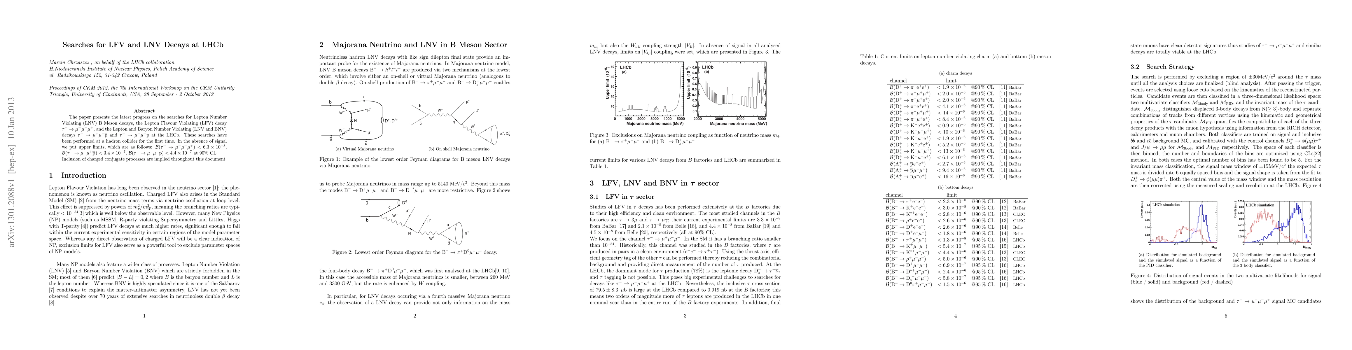 The paper reports on pioneering searches for Lepton Flavour Violating (LFV) and Lepton Number Violating (LNV) B Meson decays at LHCb, setting stringent upper limits on the branching ratios for these rare decays without observing any signal.