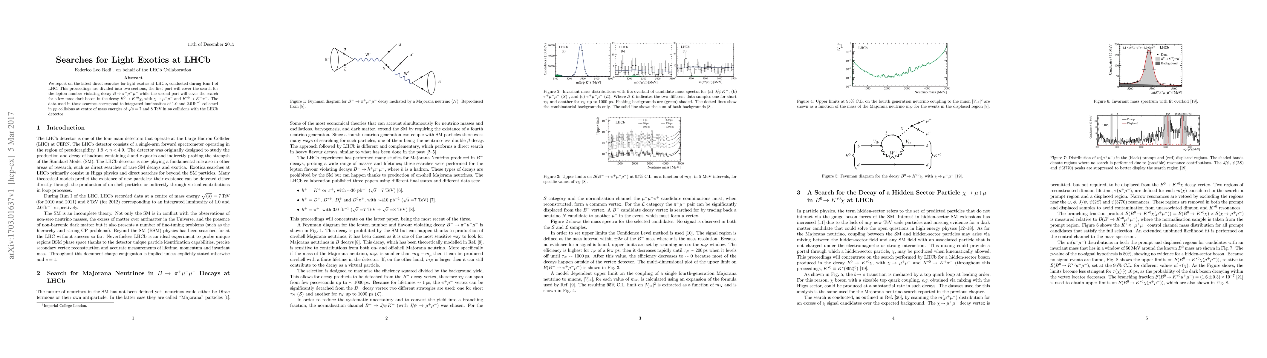 This paper reports on LHCb's latest searches for light exotic particles during Run I, focusing on the lepton number violating decay ${B}\rightarrow {\pi^{+}\mu^{-}\mu^{-}}$ and the potential decay of a low mass dark boson in $B^0 \rightarrow K^{*0}\chi$, with $\chi \rightarrow \mu^+\mu^-$ and $K^{*0} \rightarrow K^+\pi^-$. Data from 1.0 and 2.0 fb$^{-1}$ of $pp$ collisions at 7 and 8 TeV energies were analyzed.