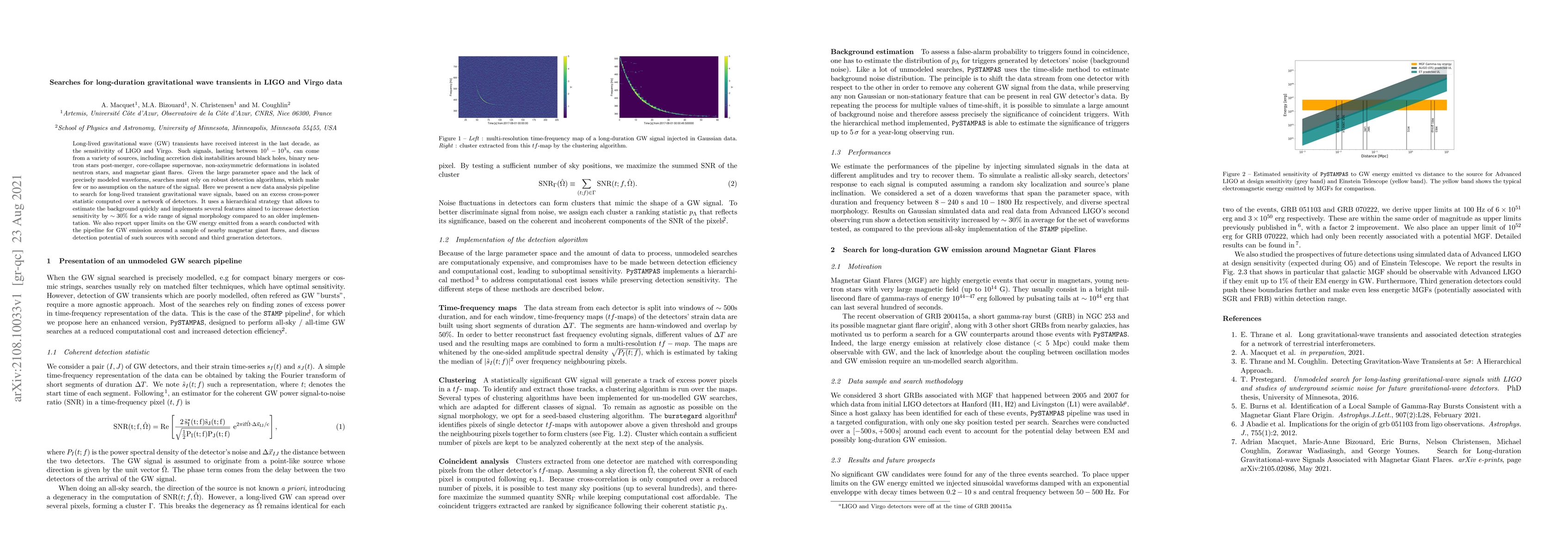 This paper introduces a new data analysis pipeline for detecting long-duration gravitational wave transients in LIGO and Virgo data, employing a robust, assumption-free detection algorithm. The pipeline enhances detection sensitivity by 30% and reports upper limits on GW energy from magnetar flares, discussing future detection potential for next-generation detectors.