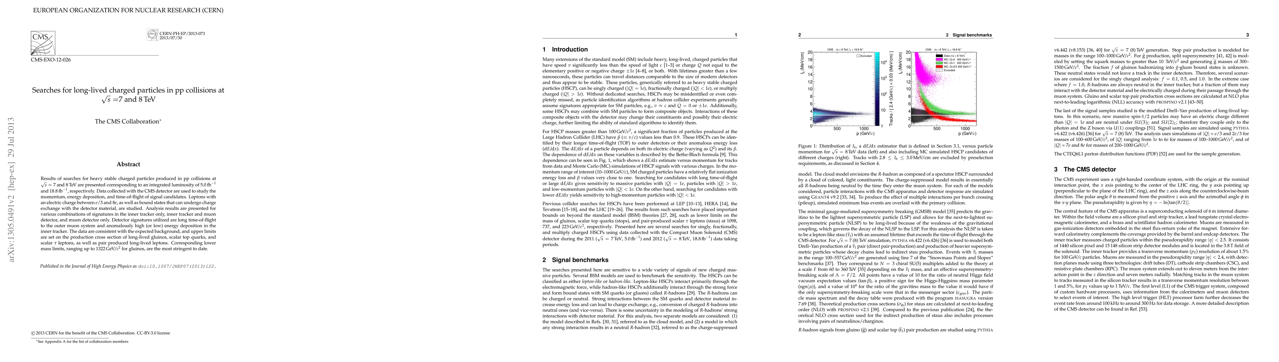 This paper reports results from searches for long-lived charged particles in proton-proton collisions at 7 and 8 TeV using the CMS detector, finding no evidence for such particles and setting stringent lower mass limits for gluinos, scalar top quarks, and scalar tau leptons.