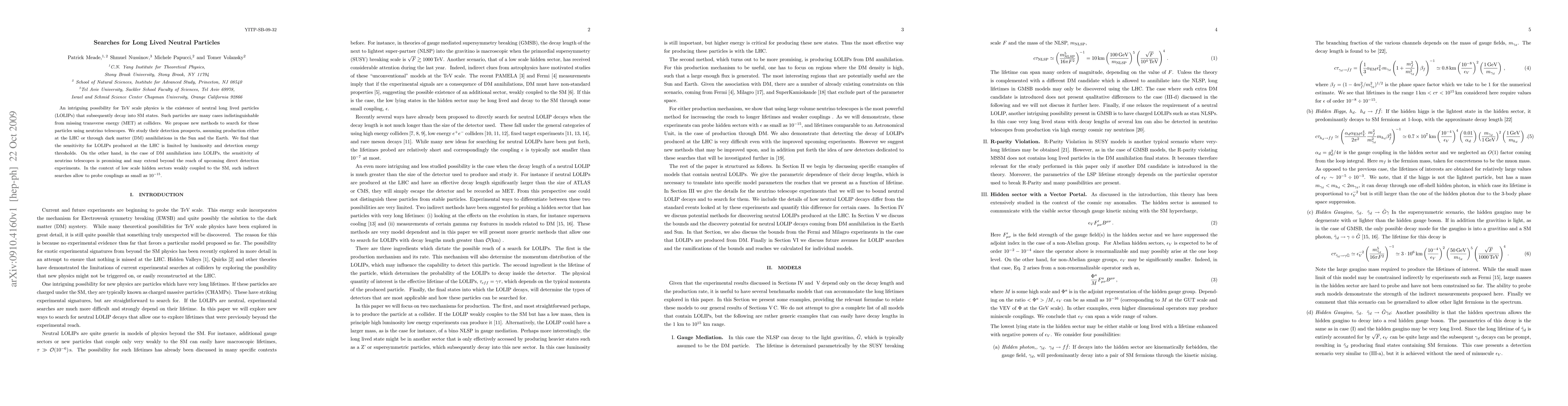 This paper proposes new methods using neutrino telescopes to search for long-lived neutral particles (LOLIPs) that could be produced at the LHC or through dark matter annihilations. While LHC production is limited by luminosity and energy thresholds, neutrino telescopes show promising sensitivity for LOLIPs from dark matter, potentially probing very weak couplings.