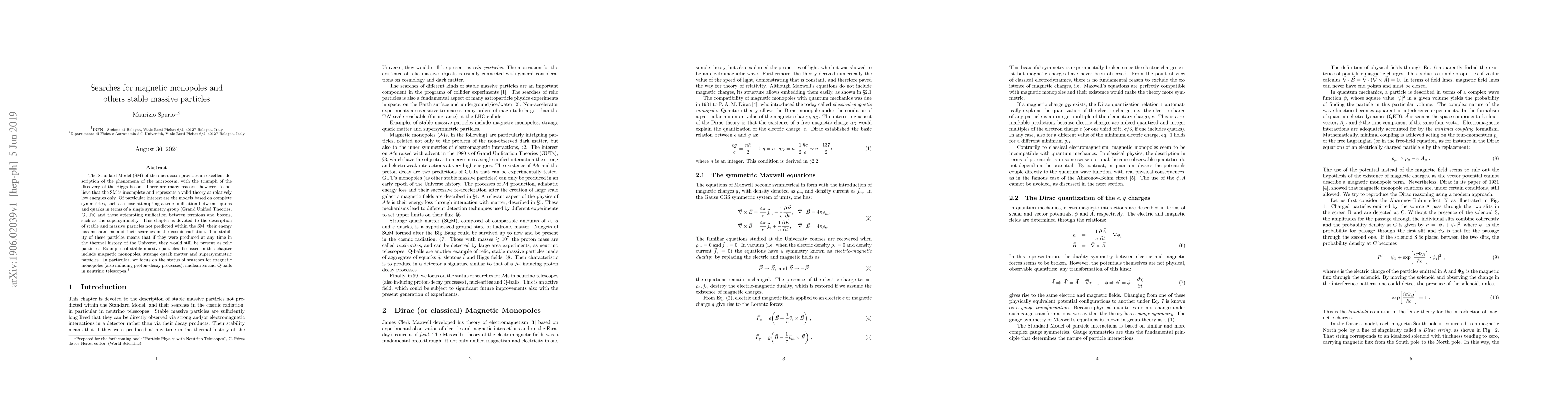 The Standard Model (SM) of the microcosm provides an excellent description of the phenomena of the microcosm, with the triumph of the discovery of the Higgs boson. There are many reasons, however, to believe that the SM is incomplete and represents a valid theory at relatively low energies only. Of particular interest are the models based on complete symmetries, such as those attempting a true unification between leptons and quarks in terms of a single symmetry group (Grand Unified Theories, GUTs) and those attempting unification between fermions and bosons, such as the supersymmetry. This chapter is devoted to the description of stable and massive particles not predicted within the SM, their energy loss mechanisms and their searches in the cosmic radiation. The stability of these particles means that if they were produced at any time in the thermal history of the Universe, they would still be present as relic particles. Examples of stable massive particles discussed in this chapter include magnetic monopoles, strange quark matter and supersymmetric particles. In particular, we focus on the status of searches for magnetic monopoles (also inducing proton-decay processes), nuclearites and Q-balls in neutrino telescopes.