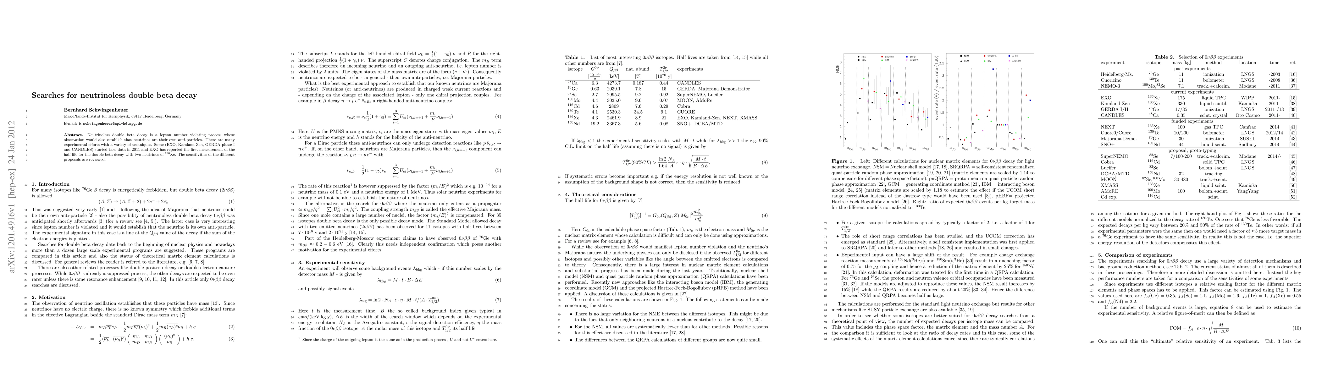 Researchers review experimental efforts to detect neutrinoless double beta decay, a process that could confirm neutrinos are their own anti-particles, with some experiments reporting first measurements of half-life for the double beta decay of 136Xe.
