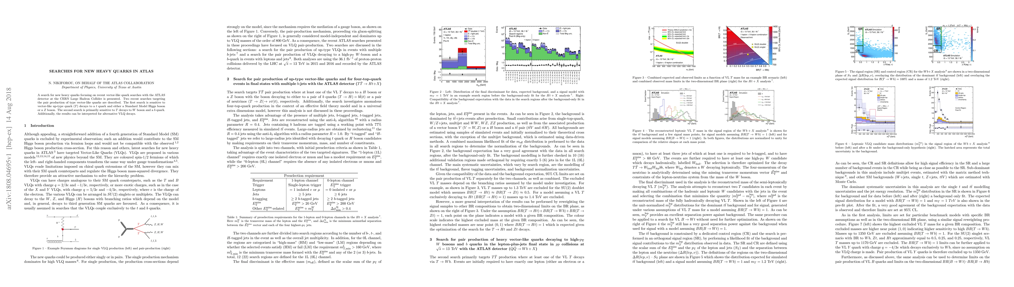 This paper presents results from ATLAS searches for new heavy vector-like quarks, focusing on pair production of up-type vector-like quarks ($T$), with analyses targeting decays to $tZ$, $Wb$, and alternative decay modes. No significant deviations from Standard Model predictions are observed.