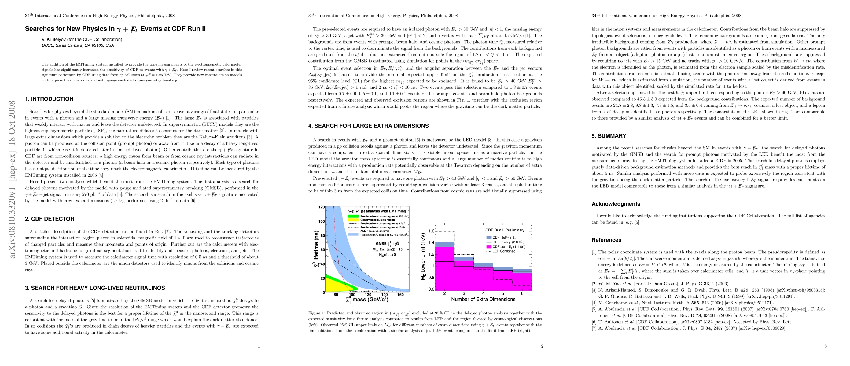 The addition of the EMTiming system installed to provide the time measurements of the electromagnetic calorimeter signals has significantly increased the sensitivity of CDF to events with a photon and a missing energy. Here I review recent searches in this signature performed by CDF using data from proton-antiproton collisions at the center of mass energy of 1.96 TeV. They provide new constraints on models with large extra dimensions and with gauge mediated supersymmetry breaking.