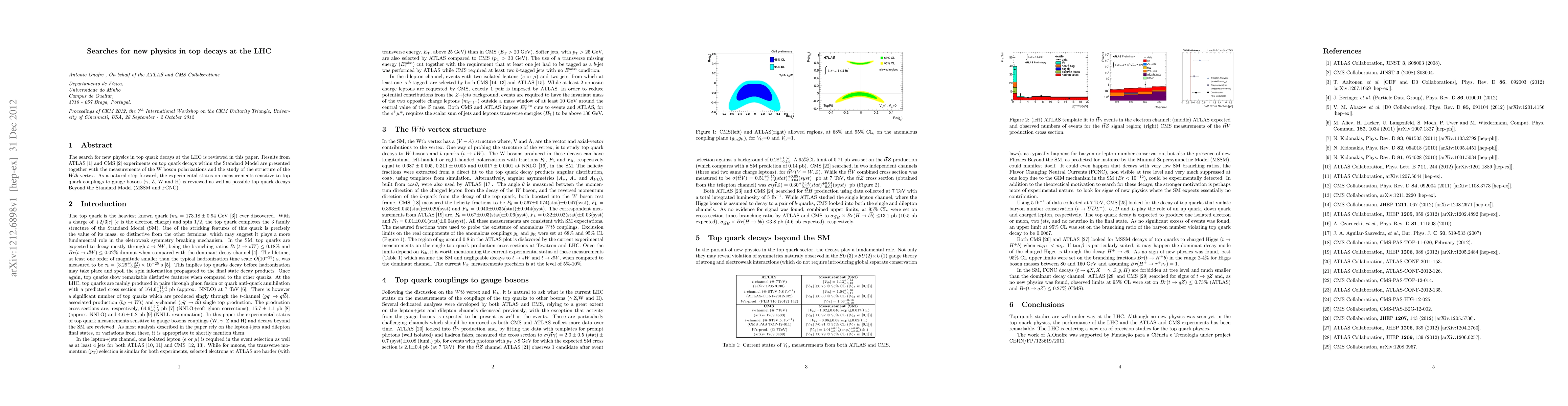 This paper reviews searches for new physics in top quark decays at the LHC, focusing on results from ATLAS and CMS experiments, including W boson polarizations, Wtb vertex structure, and measurements sensitive to top quark couplings to gauge bosons, alongside explorations of potential Beyond the Standard Model decays.