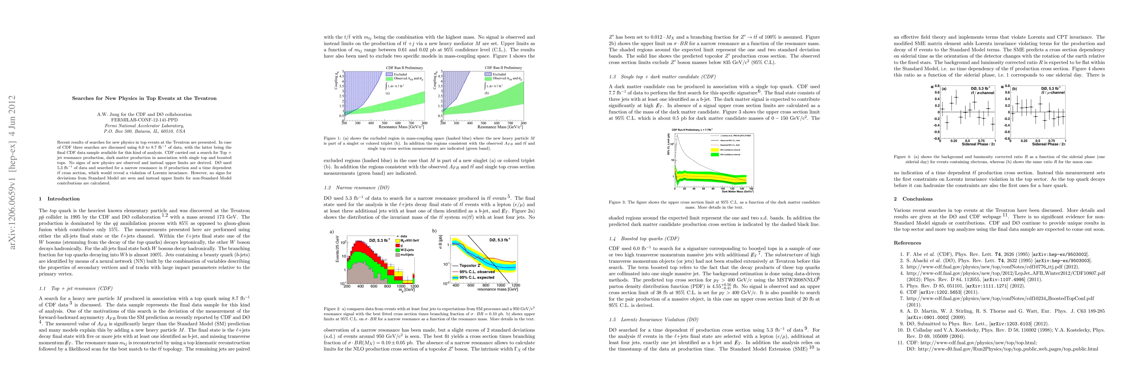 The paper presents results from CDF and D{\O} searches for new physics in top events at the Tevatron, using data samples up to 8.7 fb^{-1}. No evidence of new physics was found, and upper limits for potential new phenomena were established.