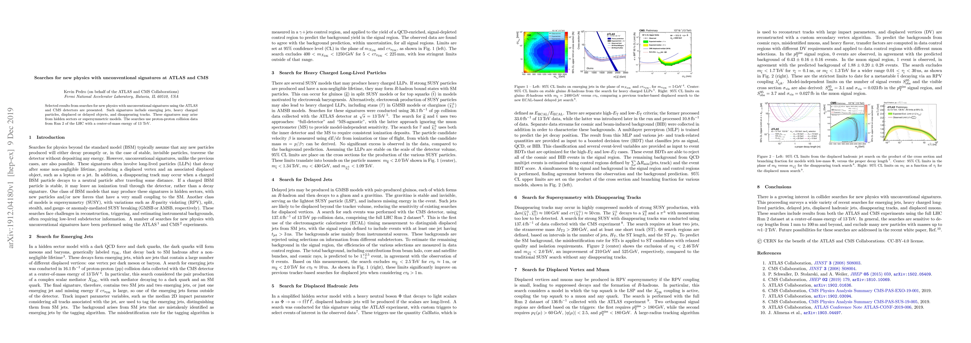 The research presents selected results from searches for new physics with unconventional signatures using the ATLAS and CMS detectors at the LHC's Run 2, with a center-of-mass energy of 13 TeV. It covers signatures such as emerging jets, heavy charged particles, displaced or delayed objects, and disappearing tracks, which may arise from hidden sectors or supersymmetric models.