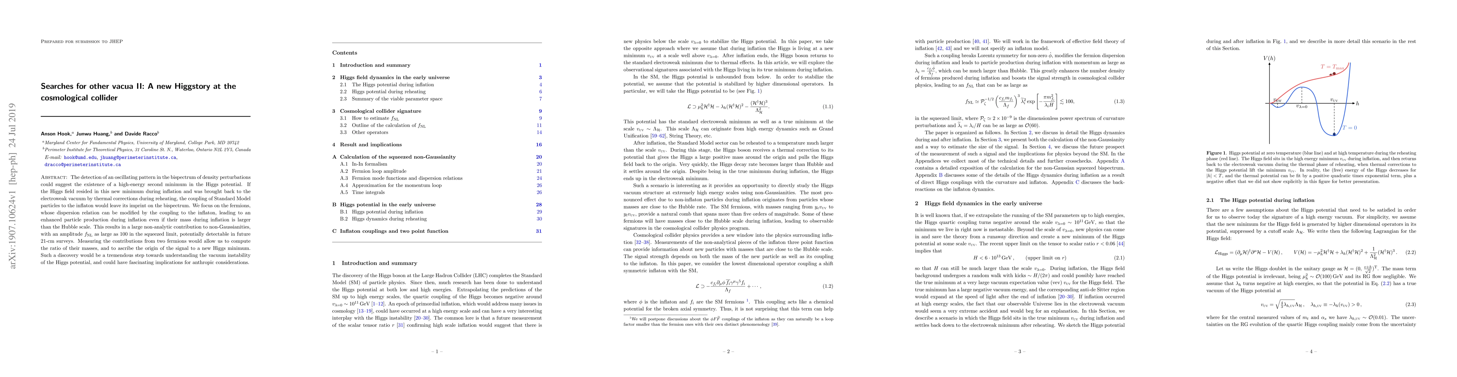 The detection of an oscillating pattern in the bispectrum of density perturbations could suggest the existence of a high-energy second minimum in the Higgs potential. If the Higgs field resided in this new minimum during inflation and was brought back to the electroweak vacuum by thermal corrections during reheating, the coupling of Standard Model particles to the inflaton would leave its imprint on the bispectrum. We focus on the fermions, whose dispersion relation can be modified by the coupling to the inflaton, leading to an enhanced particle production during inflation even if their mass during inflation is larger than the Hubble scale. This results in a large non-analytic contribution to non-Gaussianities, with an amplitude $f_{\rm NL}$ as large as $100$ in the squeezed limit, potentially detectable in future 21-cm surveys. Measuring the contributions from two fermions would allow us to compute the ratio of their masses, and to ascribe the origin of the signal to a new Higgs minimum. Such a discovery would be a tremendous step towards understanding the vacuum instability of the Higgs potential, and could have fascinating implications for anthropic considerations.