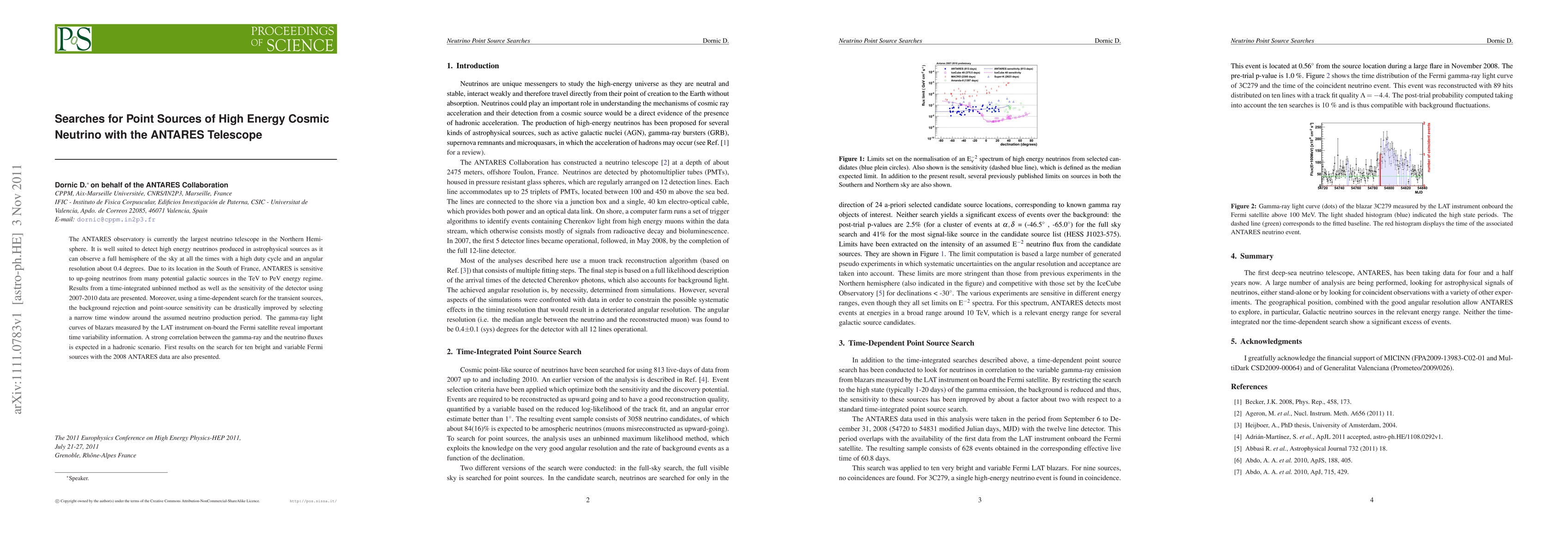 The ANTARES observatory is currently the largest neutrino telescope in the Northern Hemisphere. It is well suited to detect high energy neutrinos produced in astrophysical sources as it can observe a full hemisphere of the sky at all the times with a high duty cycle and an angular resolution about 0.4 degrees. Due to its location in the South of France, ANTARES is sensitive to up-going neutrinos from many potential galactic sources in the TeV to PeV energy regime. Results from a time-integrated unbinned method as well as the sensitivity of the detector using 2007-2010 data are presented. Moreover, using a time-dependent search for the transient sources, the background rejection and point-source sensitivity can be drastically improved by selecting a narrow time window around the assumed neutrino production period. The gamma-ray light curves of blazars measured by the LAT instrument on-board the Fermi satellite reveal important time variability information. A strong correlation between the gamma-ray and the neutrino fluxes is expected in a hadronic scenario. First results on the search for ten bright and variable Fermi sources with the 2008 ANTARES data are also presented.