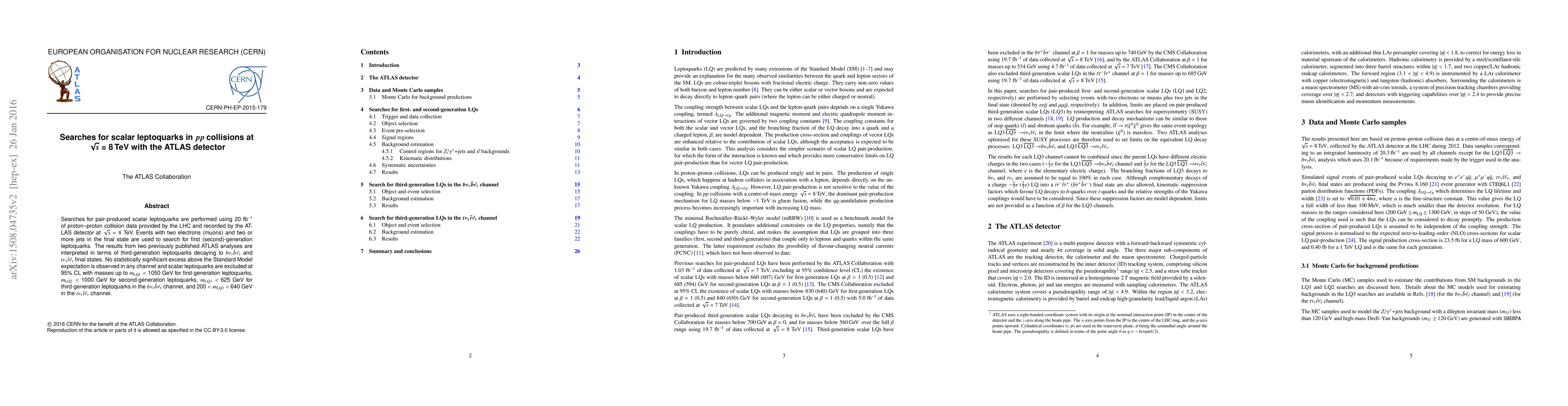 The ATLAS experiment at the LHC searched for pair-produced scalar leptoquarks in $pp$ collisions at $\sqrt{s}=8$ TeV using 20 fb$^{-1}$ of data, finding no evidence for their existence. Scalar leptoquarks are excluded up to 1050 GeV for first-generation, 1000 GeV for second-generation, and 625 GeV for third-generation in specific decay channels.