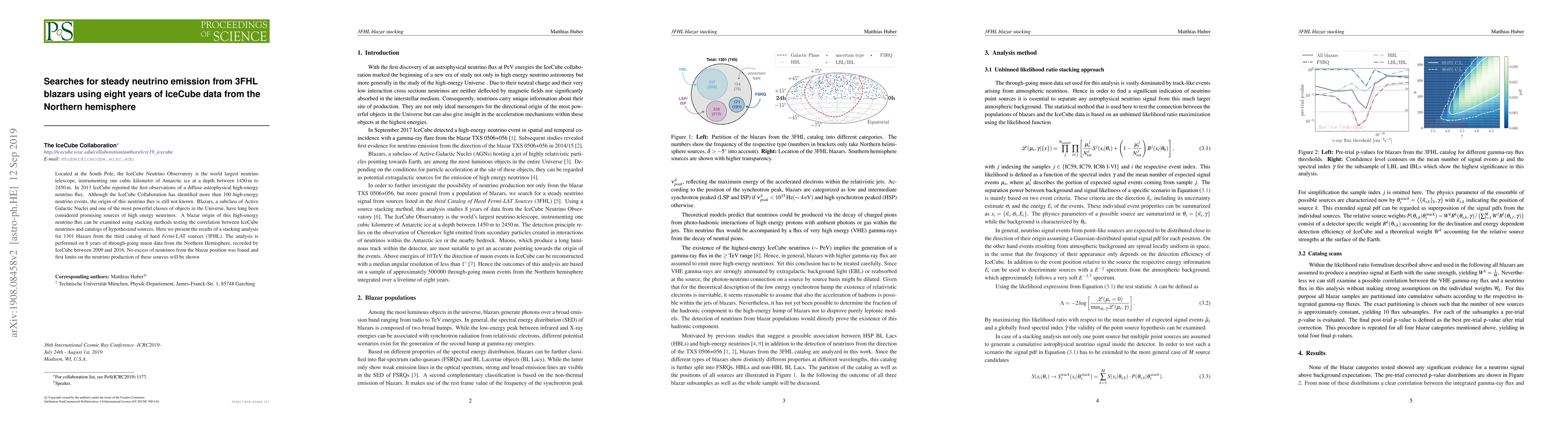 This study uses eight years of IceCube data to search for steady neutrino emission from 1301 blazars listed in the 3FHL catalog. No significant neutrino excess was detected from blazar positions, leading to the establishment of new limits on neutrino production from these sources.