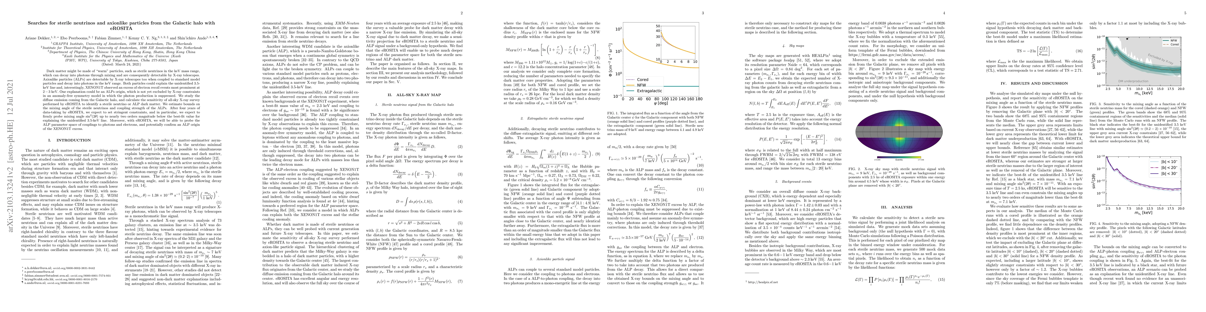 Dark matter might be made of "warm" particles, such as sterile neutrinos in the keV mass range, which can decay into photons through mixing and are consequently detectable by X-ray telescopes. Axionlike particles (ALPs) are detectable by X-ray telescopes too when coupled to standard model particles and decay into photons in the keV range. Both particles could explain the unidentified 3.5 keV line and, interestingly, XENON1T observed an excess of electron recoil events most prominent at 2-3 keV. One explanation could be an ALPs origin, which is not yet excluded by X-ray constraints in an anomaly-free symmetry model in which the photon production is suppressed. We study the diffuse emission coming from the Galactic halo, and calculate the sensitivity of all-sky X-ray survey performed by eROSITA to identify a sterile neutrino or ALP dark matter. We estimate bounds on the mixing angle of the sterile neutrinos and coupling strength of the ALPs. After four years of data-taking by eROSITA, we expect to set stringent constraints, and in particular, we expect to firmly probe mixing angle $\sin^2(2\theta)$ up to nearly two orders magnitude below the best-fit value for explaining the unidentified 3.5 keV line. Moreover, with eROSITA, we will be able to probe the ALP parameter space of couplings to photons and electrons, and potentially confirm an ALP origin of the XENON1T excess.