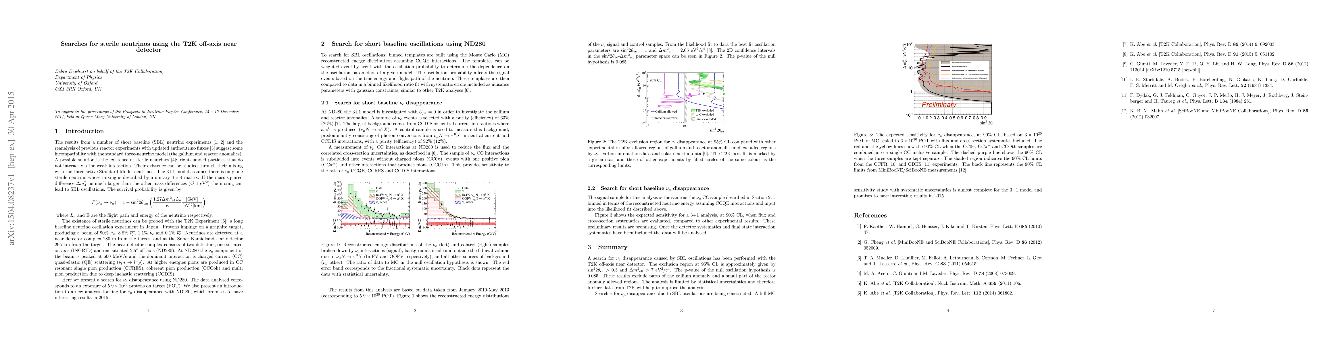 In the last decades, the results from a number of short-baseline neutrino experiments and the reanalysis of previous reactor experiments with updated antineutrino fluxes suggest some incompatibility with the standard three-neutrino model. A possible solution to these anomalies is the existence of neutrinos that do not interact via the electroweak force, known as sterile neutrinos. The existence of sterile neutrinos can be investigated with the T2K Experiment. Here we present a search for the disappearance of electron neutrinos over a baseline of 280 m using the T2K off-axis near detector. The data analysed corresponds to an exposure of $5.9 \times 10^{20}$ protons on target. The region $\sin^2 2 \theta > 0.2$ and $\Delta m^2 > 8~\textrm{eV}^2$ is excluded at 95% CL. We also present an introduction to a new analysis looking for muon neutrino disappearance with the T2K near detector, which is in its early stages but promises to have interesting results in 2015.
