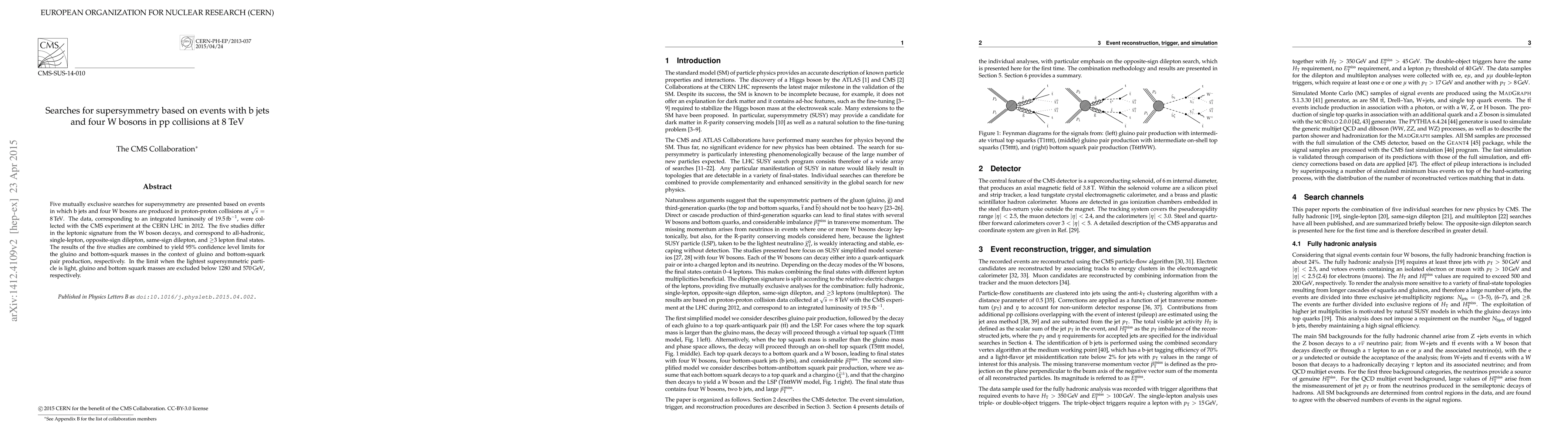 This research, using data from 8 TeV proton-proton collisions at the LHC, presents five independent searches for supersymmetry. Analyzing events with b jets and four W bosons across various leptonic signatures, the study excludes gluino masses below 1280 GeV and bottom-squark masses below 570 GeV at 95% confidence level, assuming a lightest supersymmetric particle.