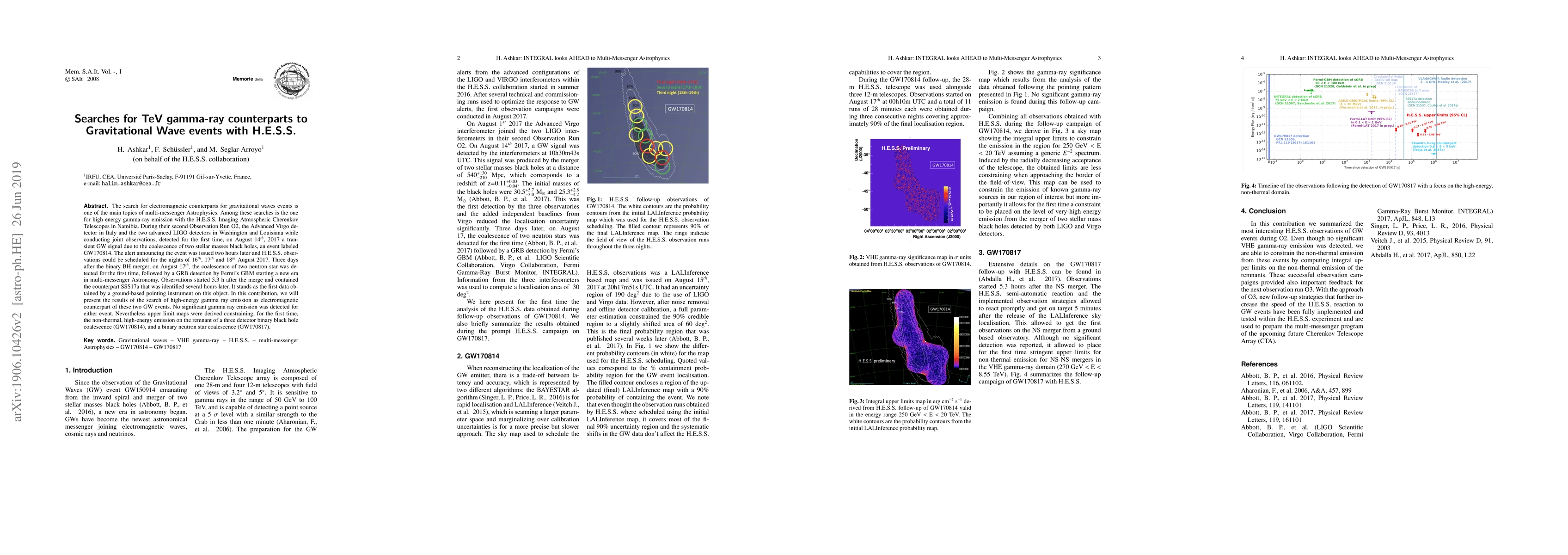 This paper reports on H.E.S.S. observations of high-energy gamma-ray counterparts for two gravitational wave events: GW170814 from black hole merger and GW170817 from neutron star merger. No significant gamma-ray emission was detected, but upper limits were established for the first time on high-energy emissions from these events.
