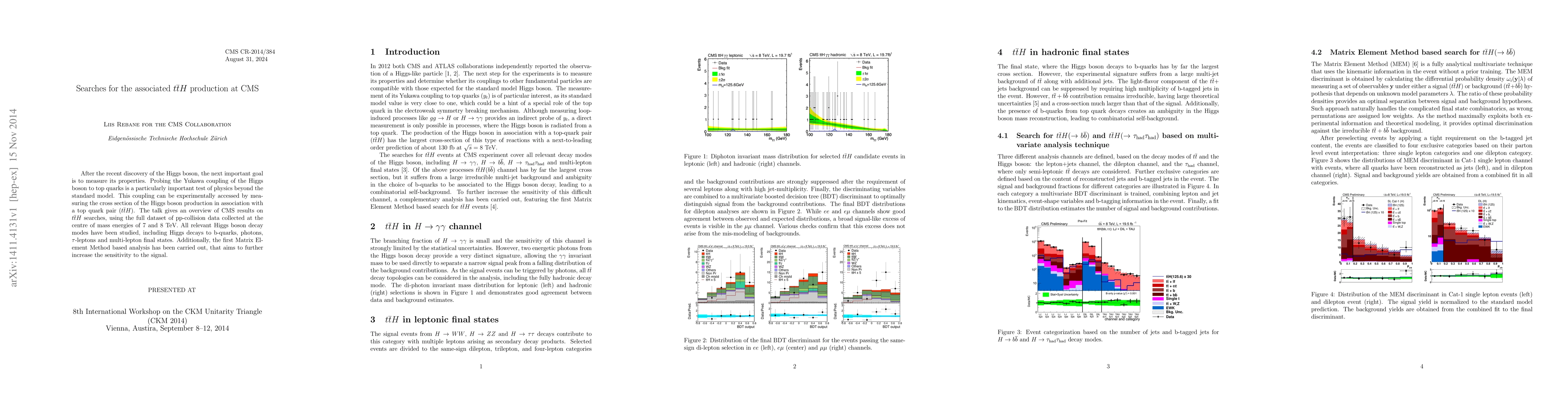 This paper summarizes CMS results on searches for the associated $t\bar{t}H$ production using data from pp-collisions at 7 and 8 TeV, focusing on various Higgs decay modes and employing a novel Matrix Element Method to enhance signal sensitivity.
