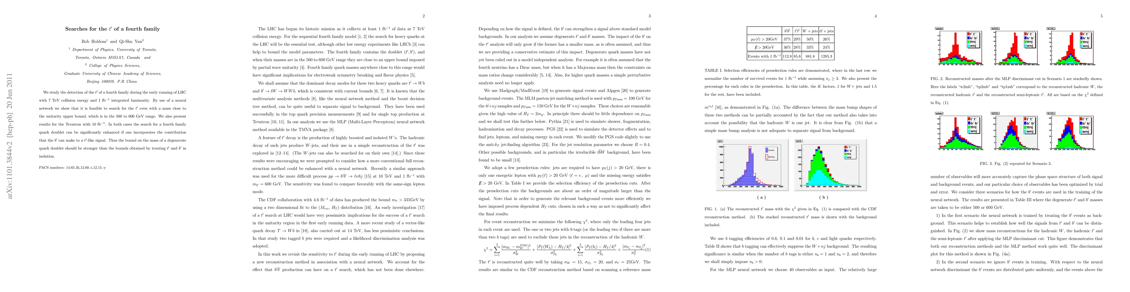 We study the detection of the $t^\prime$ of a fourth family during the early running of LHC with 7 TeV collision energy and 1 fb$^{-1}$ integrated luminosity. By use of a neural network we show that it is feasible to search for the $t'$ even with a mass close to the unitarity upper bound, which is in the 500 to 600 GeV range. We also present results for the Tevatron with $10 \,\, \textrm{fb}^{-1}$. In both cases the search for a fourth family quark doublet can be significantly enhanced if one incorporates the contribution that the $b'$ can make to a $t'$-like signal. Thus the bound on the mass of a degenerate quark doublet should be stronger than the bounds obtained by treating $t'$ and $b'$ in isolation.