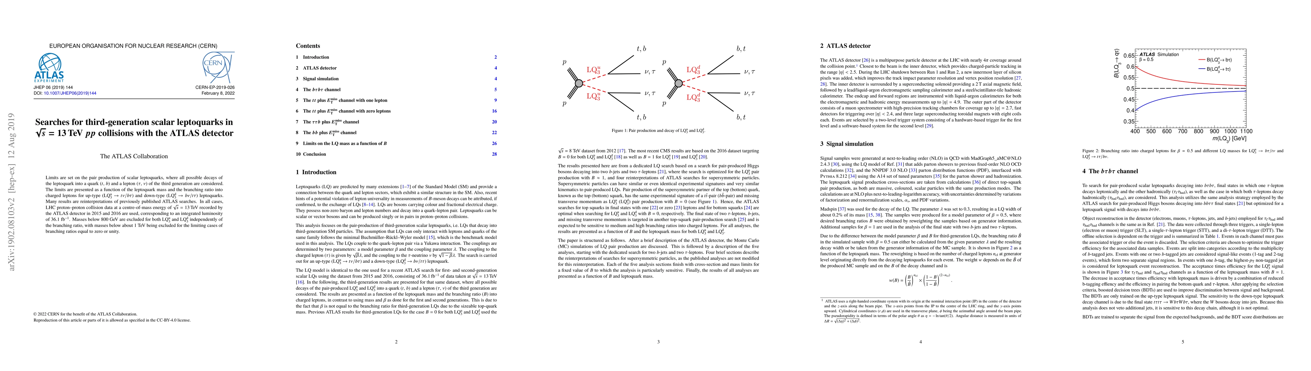 Limits are set on the pair production of scalar leptoquarks, where all possible decays of the leptoquark into a quark ($t$, $b$) and a lepton ($\tau$, $\nu$) of the third generation are considered. The limits are presented as a function of the leptoquark mass and the branching ratio into charged leptons for up-type ($\mathrm{LQ}_{3}^{u}$ $\rightarrow t \nu / b \tau$) and down-type ($\mathrm{LQ}_{3}^{d}$ $\rightarrow b \nu / t \tau$) leptoquarks. Many results are reinterpretations of previously published ATLAS searches. In all cases, LHC proton-proton collision data at a centre-of-mass energy of $\sqrt{s}$ = 13 TeV recorded by the ATLAS detector in 2015 and 2016 are used, corresponding to an integrated luminosity of 36.1 fb$^{-1}$. Masses below 800 GeV are excluded for both $\mathrm{LQ}_{3}^{u}$ and $\mathrm{LQ}_{3}^{d}$ independently of the branching ratio, with masses below about 1 TeV being excluded for the limiting cases of branching ratios equal to zero or unity.