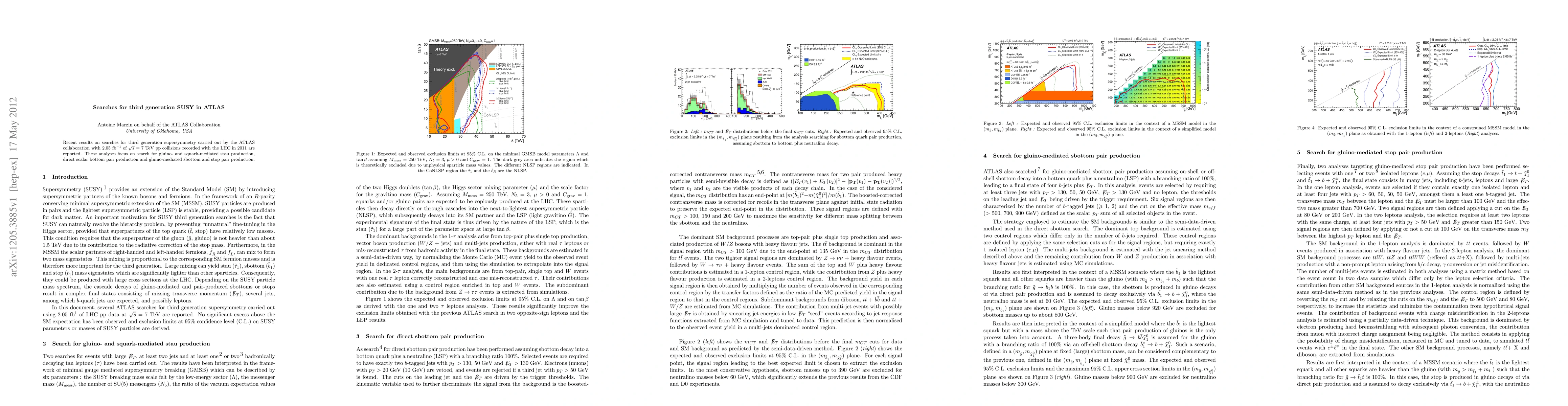 This paper reports results from ATLAS on searches for third-generation supersymmetry using 2.05 fb^-1 of 7 TeV proton-proton collision data from the LHC. The focus is on gluino- and squark-mediated stau, direct scalar bottom pair, and gluino-mediated sbottom and stop pair production.
