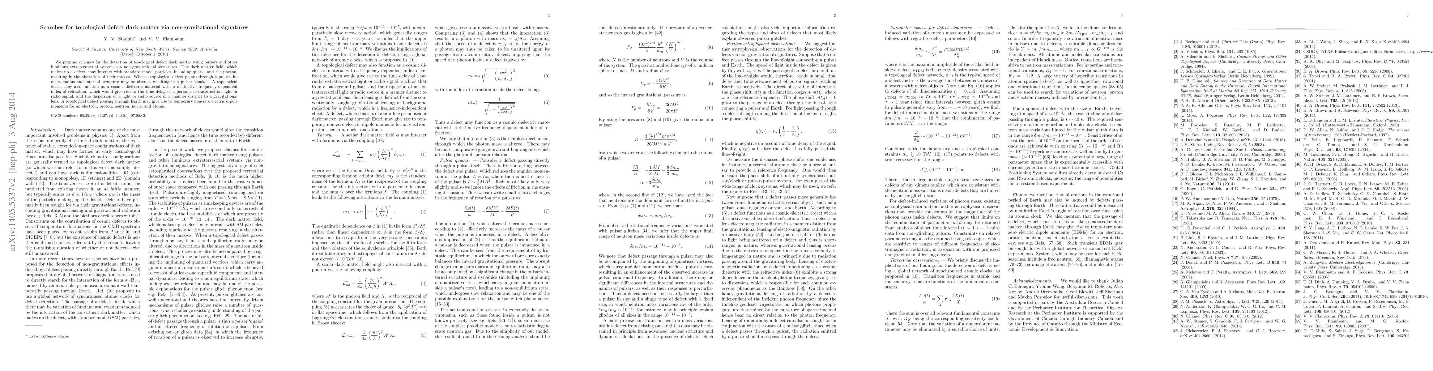 This research proposes using pulsars and other luminous extraterrestrial systems to detect topological defect dark matter via non-gravitational signatures. These signatures include altered pulsar properties due to defect passage ('pulsar quakes'), signal time delays and dispersion akin to gravitational lensing, and temporary non-zero electric dipole moments in Earth. The method offers a higher probability of detection compared to terrestrial methods due to the vastness of space.