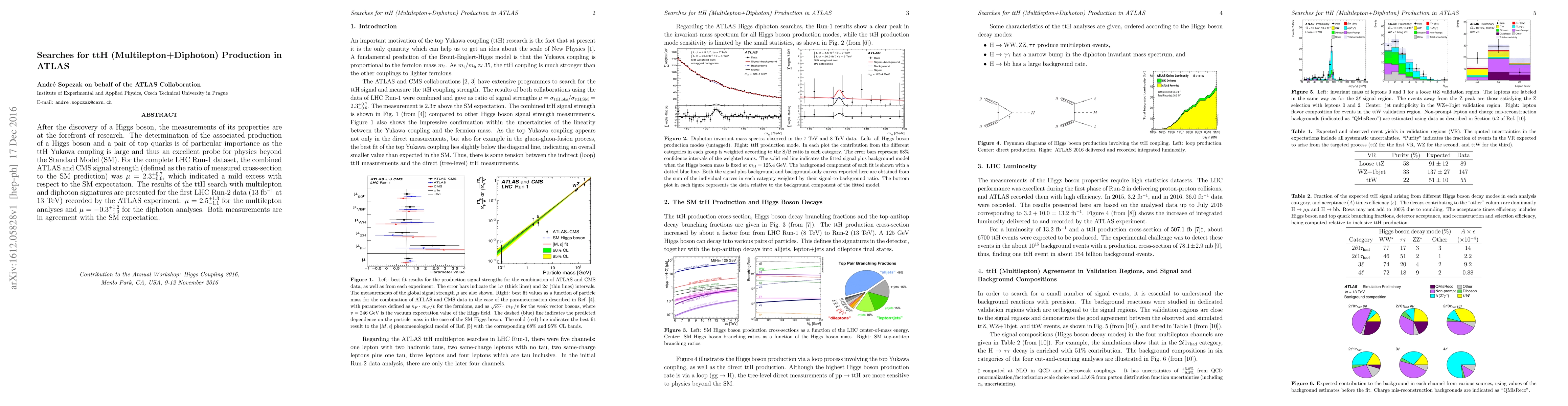 The ATLAS experiment reports results from searches for ttH production in the multilepton and diphoton channels using Run-2 data, finding signal strengths of $\mu=2.5^{+1.3}_{-1.1}$ and $\mu=-0.3^{+1.2}_{-1.0}$, respectively, consistent with Standard Model expectations.