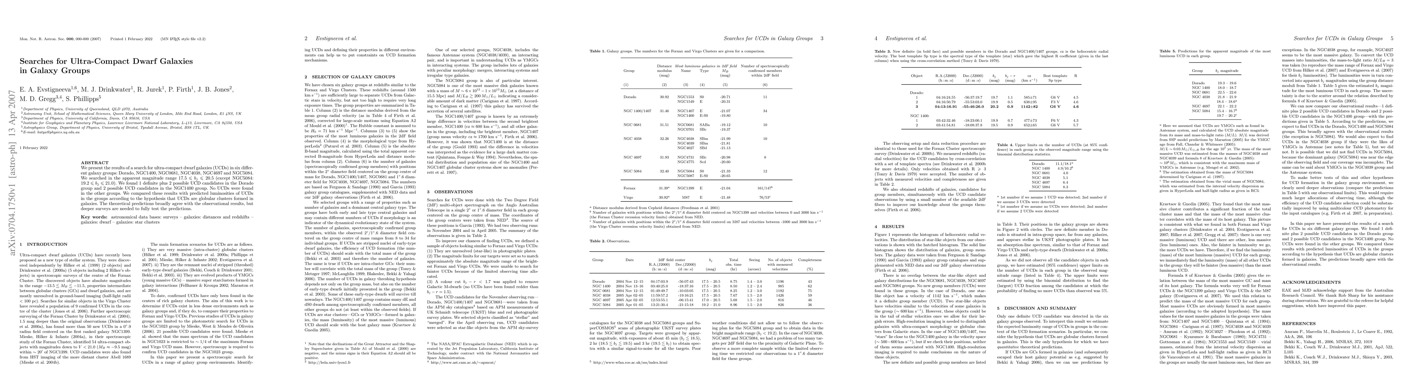 We present the results of a search for ultra-compact dwarf galaxies (UCDs) in six different galaxy groups: Dorado, NGC1400, NGC0681, NGC4038, NGC4697 and NGC5084. We searched in the apparent magnitude range 17.5 < b_j < 20.5 (except NGC5084: 19.2 < b_j < 21.0). We found 1 definite plus 2 possible UCD candidates in the Dorado group and 2 possible UCD candidates in the NGC1400 group. No UCDs were found in the other groups. We compared these results with predicted luminosities of UCDs in the groups according to the hypothesis that UCDs are globular clusters formed in galaxies. The theoretical predictions broadly agree with the observational results, but deeper surveys are needed to fully test the predictions.