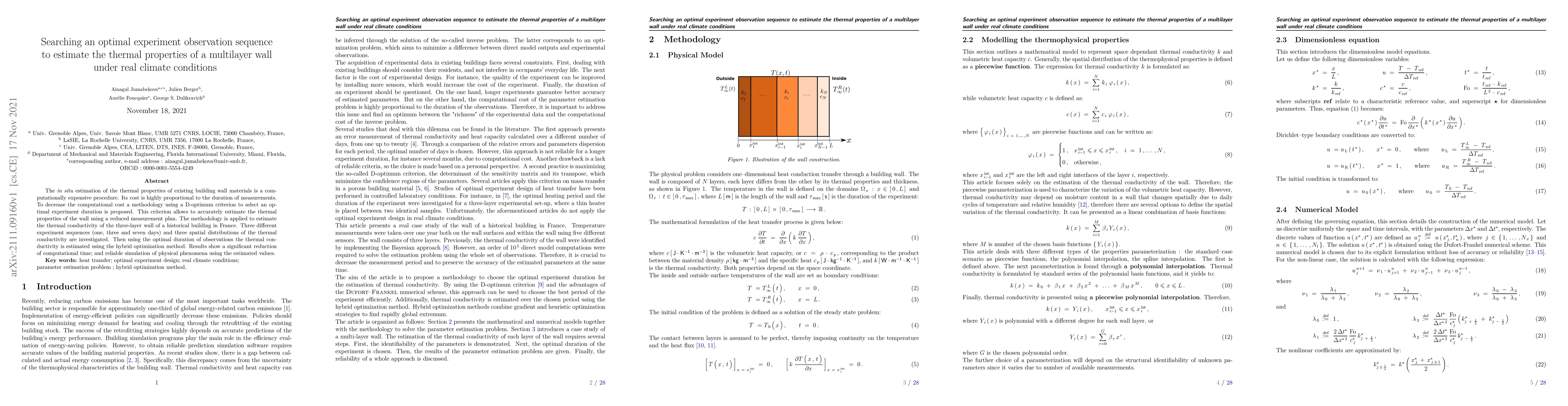 The \emph{in situ} estimation of the thermal properties of existing building wall materials is a computationally expensive procedure. Its cost is highly proportional to the duration of measurements. To decrease the computational cost a methodology using a D-optimum criterion to select an optimal experiment duration is proposed. This criterion allows to accurately estimate the thermal properties of the wall using a reduced measurement plan. The methodology is applied to estimate the thermal conductivity of the three-layer wall of a historical building in France. Three different experiment sequences (one, three and seven days) and three spatial distributions of the thermal conductivity are investigated. Then using the optimal duration of observations the thermal conductivity is estimated using the hybrid optimization method. Results show a significant reduction of computational time; and reliable simulation of physical phenomena using the estimated values.