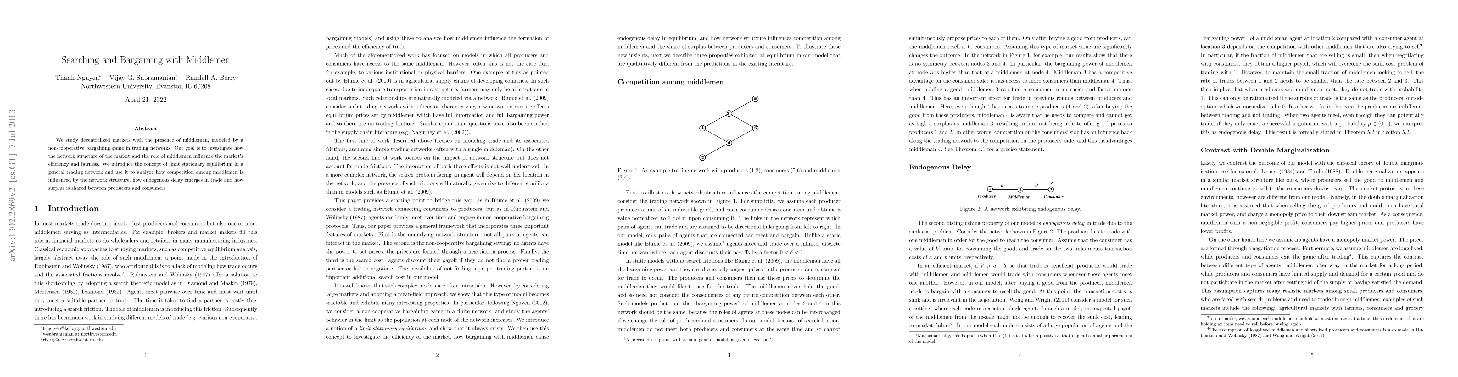 This paper examines decentralized markets with middlemen, modeling the interactions as a non-cooperative bargaining game. It introduces the concept of limit stationary equilibrium to analyze how network structure affects market efficiency, fairness, competition among middlemen, trade delays, and surplus distribution.
