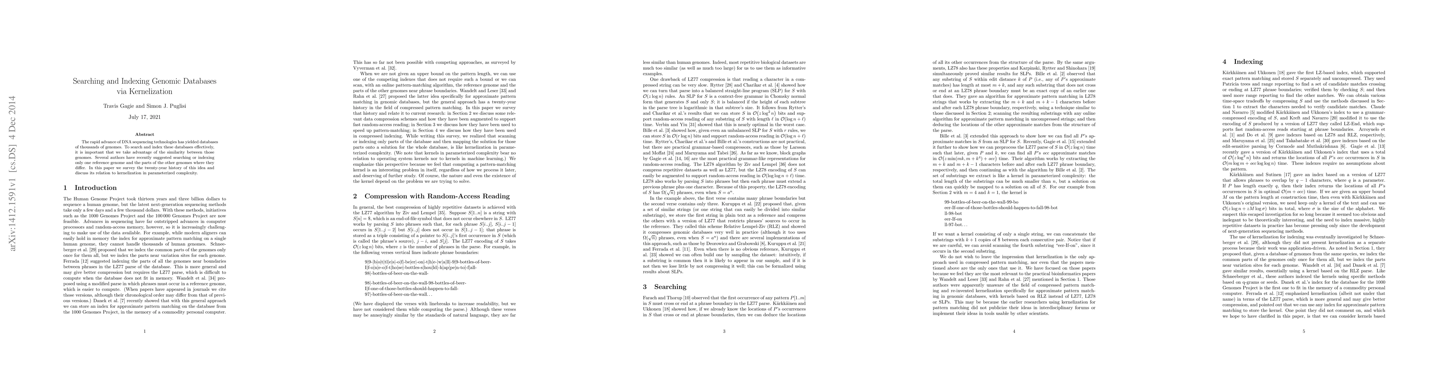 The rapid advance of DNA sequencing technologies has yielded databases of thousands of genomes. To search and index these databases effectively, it is important that we take advantage of the similarity between those genomes. Several authors have recently suggested searching or indexing only one reference genome and the parts of the other genomes where they differ. In this paper we survey the twenty-year history of this idea and discuss its relation to kernelization in parameterized complexity.