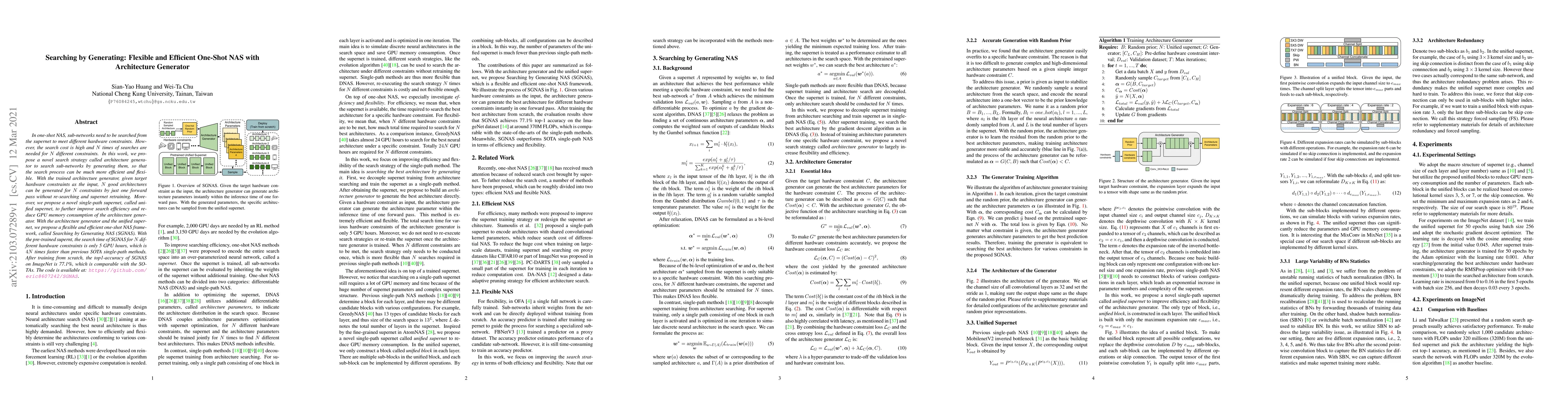 In one-shot NAS, sub-networks need to be searched from the supernet to meet different hardware constraints. However, the search cost is high and $N$ times of searches are needed for $N$ different constraints. In this work, we propose a novel search strategy called architecture generator to search sub-networks by generating them, so that the search process can be much more efficient and flexible. With the trained architecture generator, given target hardware constraints as the input, $N$ good architectures can be generated for $N$ constraints by just one forward pass without re-searching and supernet retraining. Moreover, we propose a novel single-path supernet, called unified supernet, to further improve search efficiency and reduce GPU memory consumption of the architecture generator. With the architecture generator and the unified supernet, we propose a flexible and efficient one-shot NAS framework, called Searching by Generating NAS (SGNAS). With the pre-trained supernt, the search time of SGNAS for $N$ different hardware constraints is only 5 GPU hours, which is $4N$ times faster than previous SOTA single-path methods. After training from scratch, the top1-accuracy of SGNAS on ImageNet is 77.1%, which is comparable with the SOTAs. The code is available at: https://github.com/eric8607242/SGNAS.