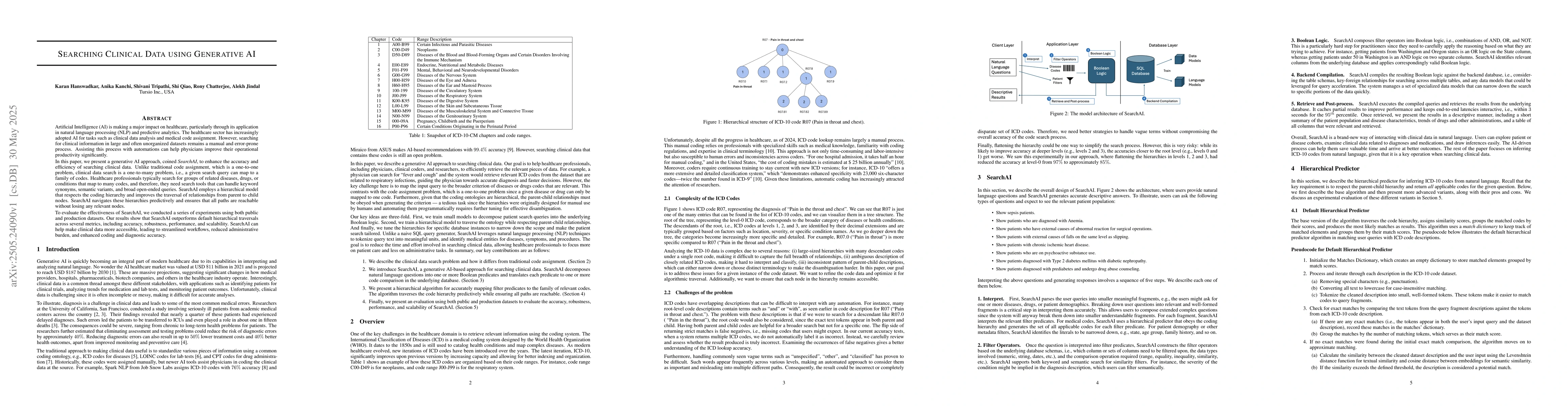 Artificial Intelligence (AI) is making a major impact on healthcare, particularly through its application in natural language processing (NLP) and predictive analytics. The healthcare sector has increasingly adopted AI for tasks such as clinical data analysis and medical code assignment. However, searching for clinical information in large and often unorganized datasets remains a manual and error-prone process. Assisting this process with automations can help physicians improve their operational productivity significantly. In this paper, we present a generative AI approach, coined SearchAI, to enhance the accuracy and efficiency of searching clinical data. Unlike traditional code assignment, which is a one-to-one problem, clinical data search is a one-to-many problem, i.e., a given search query can map to a family of codes. Healthcare professionals typically search for groups of related diseases, drugs, or conditions that map to many codes, and therefore, they need search tools that can handle keyword synonyms, semantic variants, and broad open-ended queries. SearchAI employs a hierarchical model that respects the coding hierarchy and improves the traversal of relationships from parent to child nodes. SearchAI navigates these hierarchies predictively and ensures that all paths are reachable without losing any relevant nodes. To evaluate the effectiveness of SearchAI, we conducted a series of experiments using both public and production datasets. Our results show that SearchAI outperforms default hierarchical traversals across several metrics, including accuracy, robustness, performance, and scalability. SearchAI can help make clinical data more accessible, leading to streamlined workflows, reduced administrative burden, and enhanced coding and diagnostic accuracy.