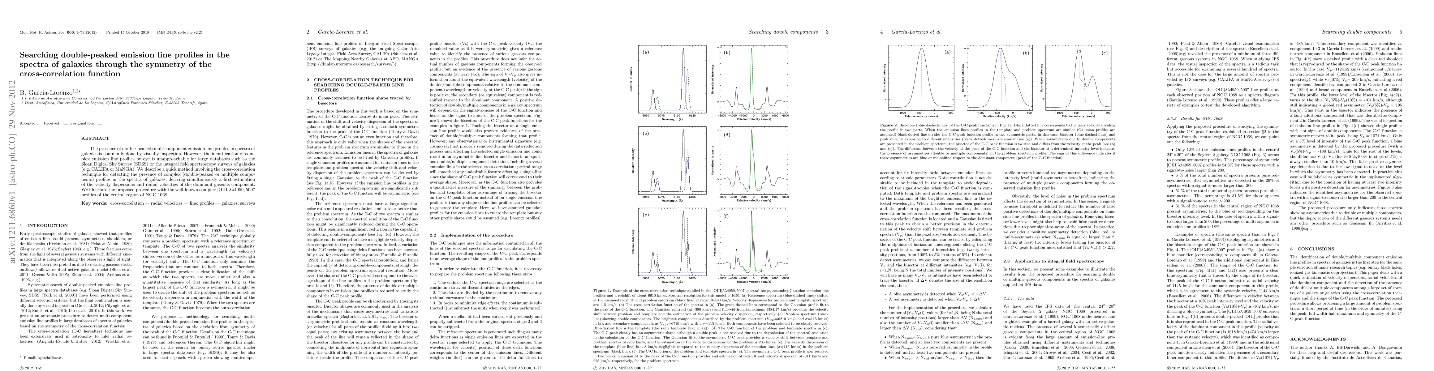 This paper proposes a cross-correlation technique to efficiently detect double-peaked emission line profiles in galaxy spectra, offering a scalable alternative to visual inspection for large datasets. The method also estimates velocity dispersions and radial velocities, demonstrated with the complex [OIII] profiles in NGC1068.