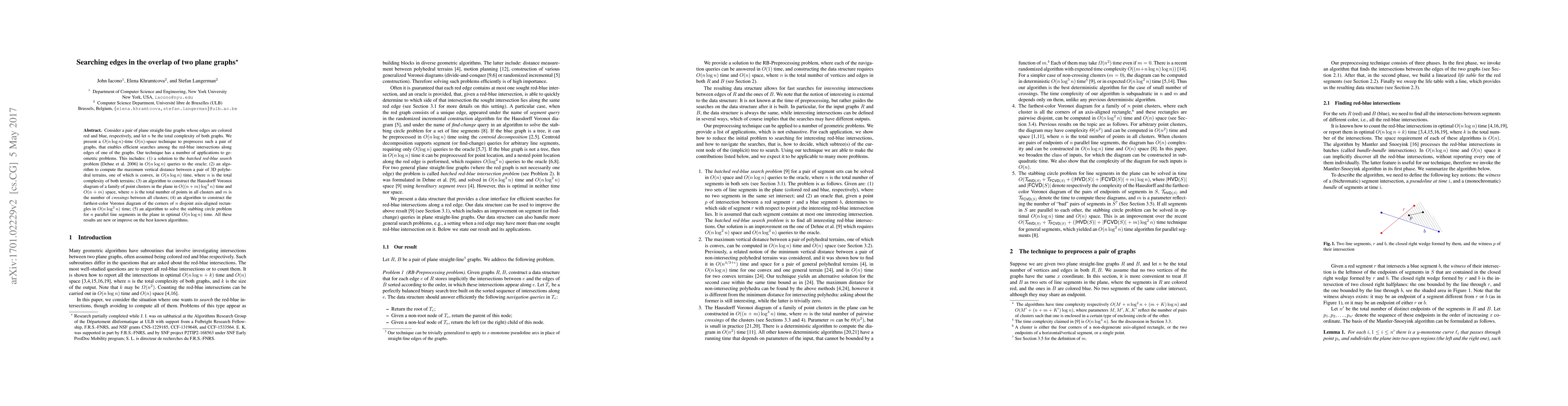 Consider a pair of plane straight-line graphs, whose edges are colored red and blue, respectively, and let n be the total complexity of both graphs. We present a O(n log n)-time O(n)-space technique to preprocess such pair of graphs, that enables efficient searches among the red-blue intersections along edges of one of the graphs. Our technique has a number of applications to geometric problems. This includes: (1) a solution to the batched red-blue search problem [Dehne et al. 2006] in O(n log n) queries to the oracle; (2) an algorithm to compute the maximum vertical distance between a pair of 3D polyhedral terrains one of which is convex in O(n log n) time, where n is the total complexity of both terrains; (3) an algorithm to construct the Hausdorff Voronoi diagram of a family of point clusters in the plane in O((n+m) log^3 n) time and O(n+m) space, where n is the total number of points in all clusters and m is the number of crossings between all clusters; (4) an algorithm to construct the farthest-color Voronoi diagram of the corners of n axis-aligned rectangles in O(n log^2 n) time; (5) an algorithm to solve the stabbing circle problem for n parallel line segments in the plane in optimal O(n log n) time. All these results are new or improve on the best known algorithms.