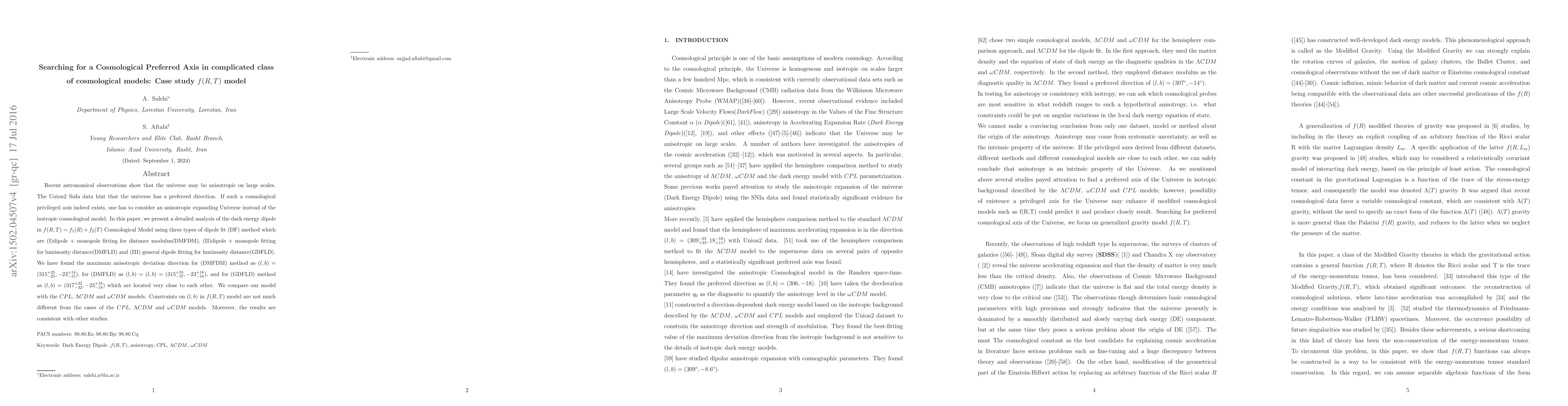 This paper investigates the presence of a cosmological preferred axis in the $f(R,T)$ model using three dipole fitting methods. The analysis finds directions of maximum anisotropy close to $(315^\circ, -23^\circ)$, consistent across methods and comparable to other cosmological models like CPL, ΛCDM, and ωCDM.