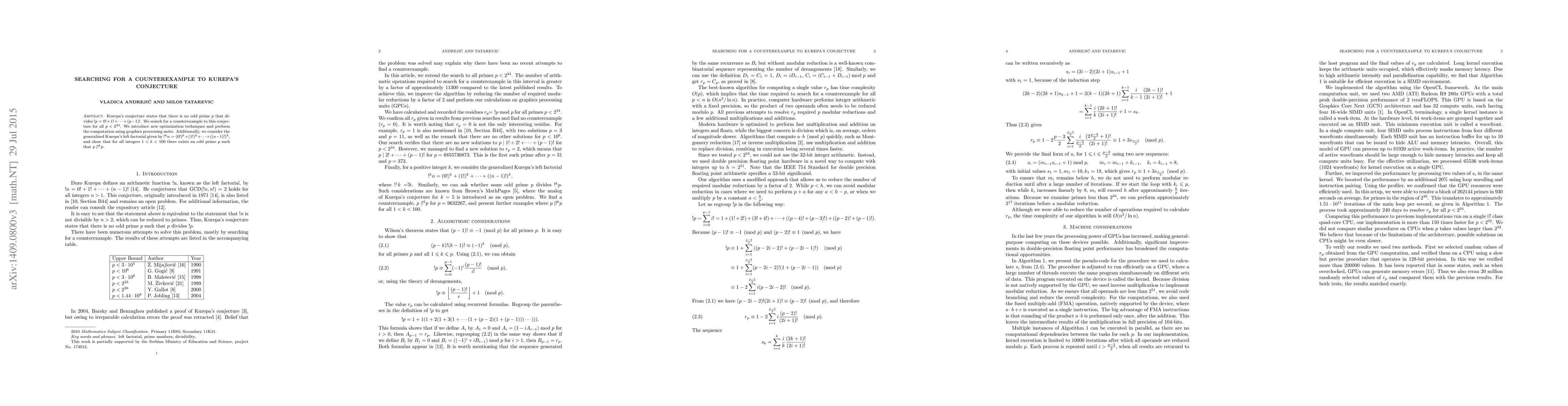 This paper explores the search for a counterexample to Kurepa's conjecture, which posits that no odd prime divides the sum of factorials up to $p-1$. Using advanced optimization and GPU computation, the authors extend their search to $p<2^{34}$ and also investigate generalized Kurepa's left factorial, finding that for $1<k<100$, there exists an odd prime dividing $!^k p$.